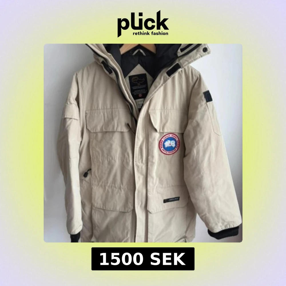 Säljer en beige äkta Canada Goose dunjacka med huva och stora fickor framtill. Jackan har klassisk patch på bröstet och dragkedja. Perfekt för kalla vinterdagar och riktigt snygg till streetwear-looken. Storlek är xxs men motsvarar s/m