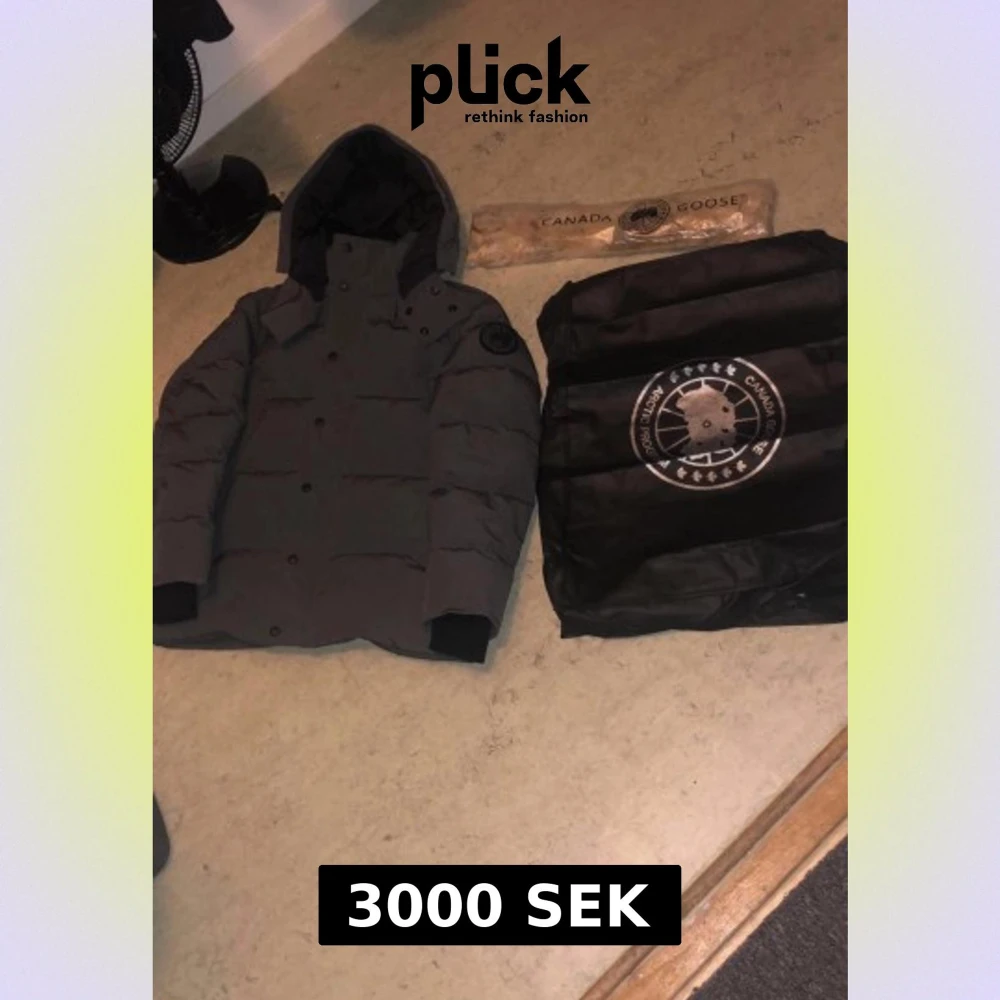 Säljer en mörkgrå dunjacka från Canada Goose med huva och svart logotyp på ärmen. Jackan har raka linjer, knappar framtill och ribbade muddar. Perfekt för kalla dagar och riktigt snygg streetstil.