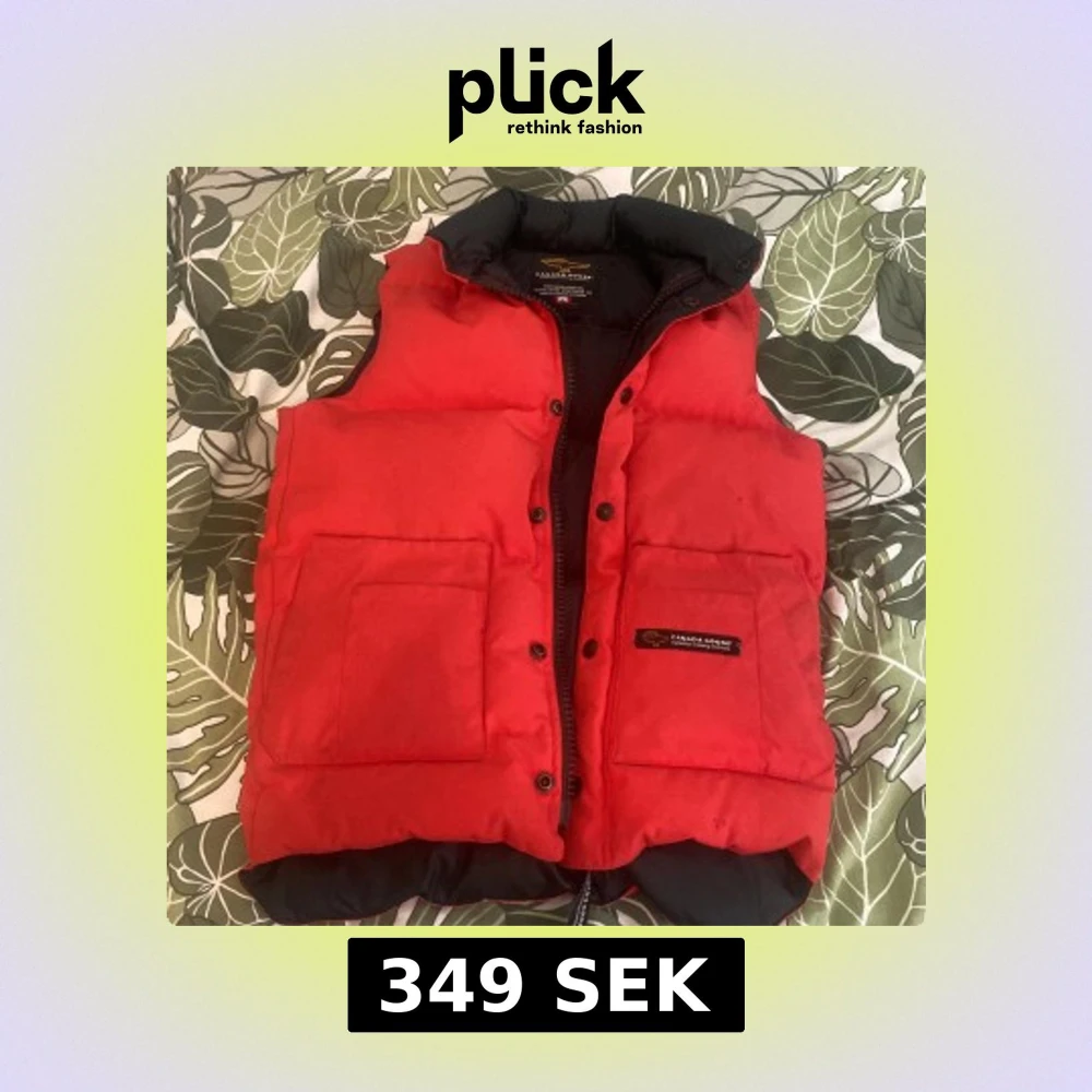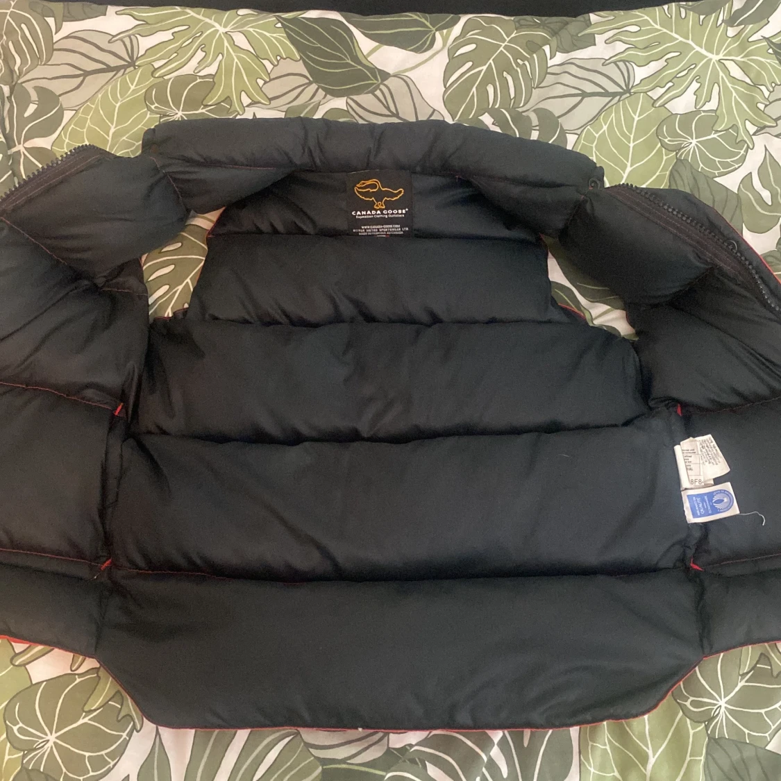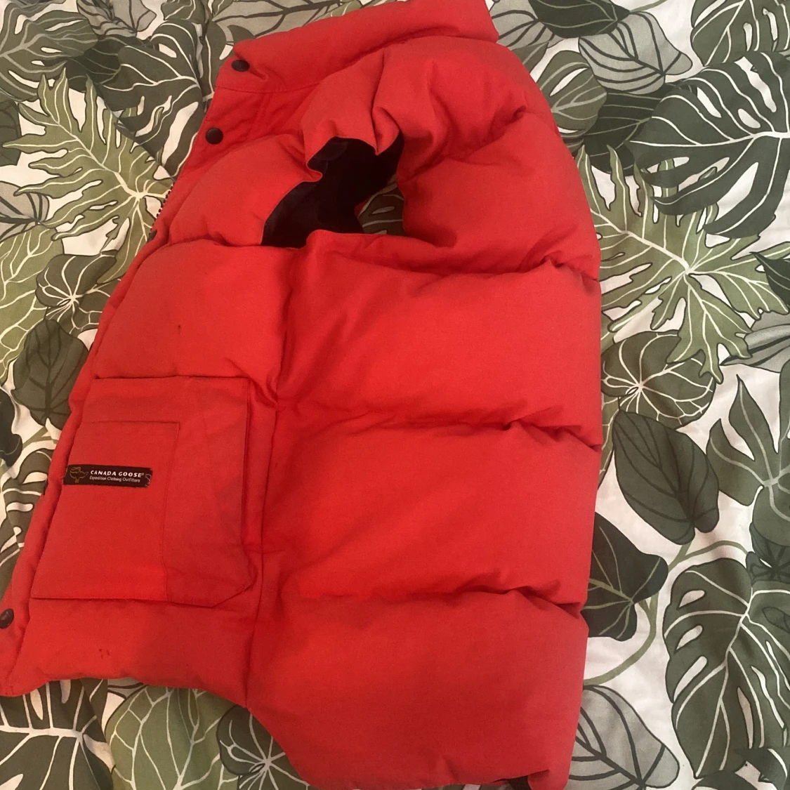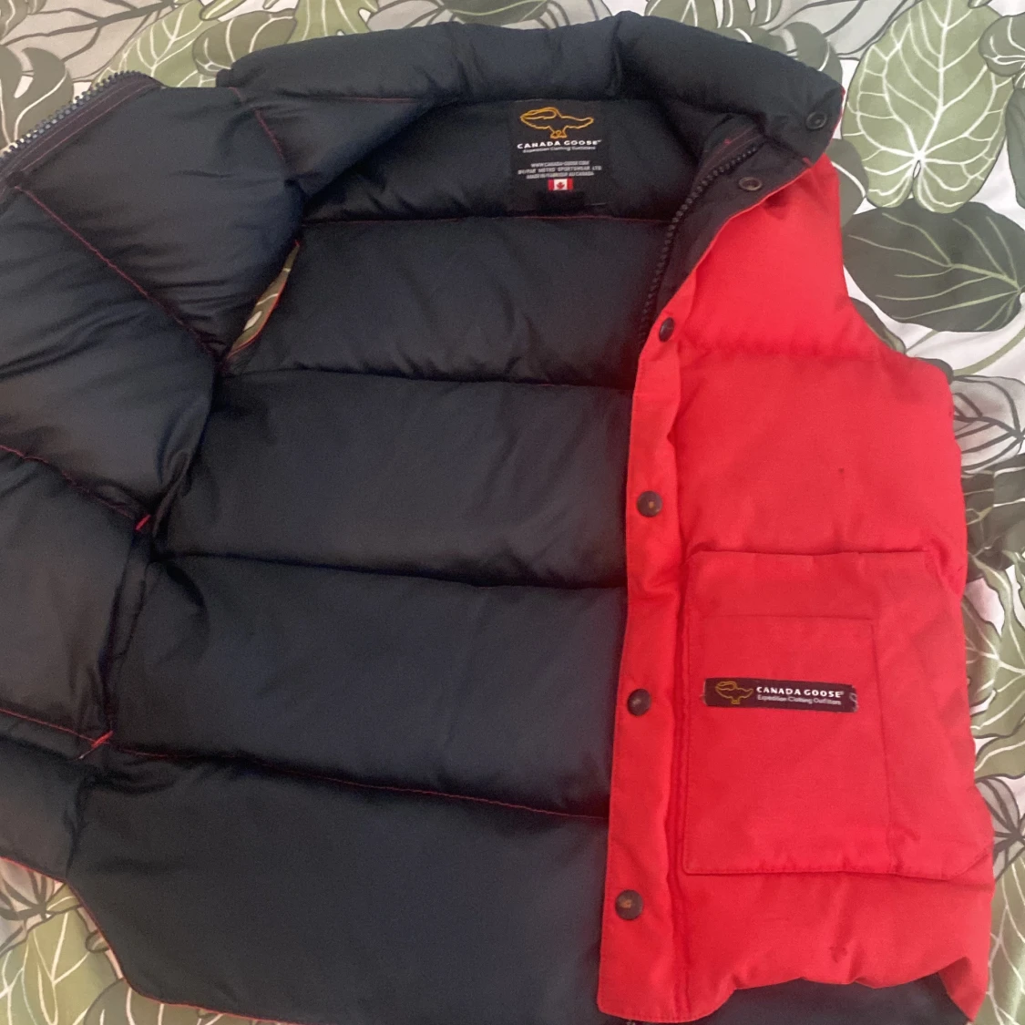 Snygg röd dunväst från Canada Goose med svart insida och hög krage. Västen har två stora fickor framtill, knappar och dragkedja. Perfekt för kalla dagar när du vill hålla värmen och ändå se cool ut. Klassisk logga på fickan och quiltad design.