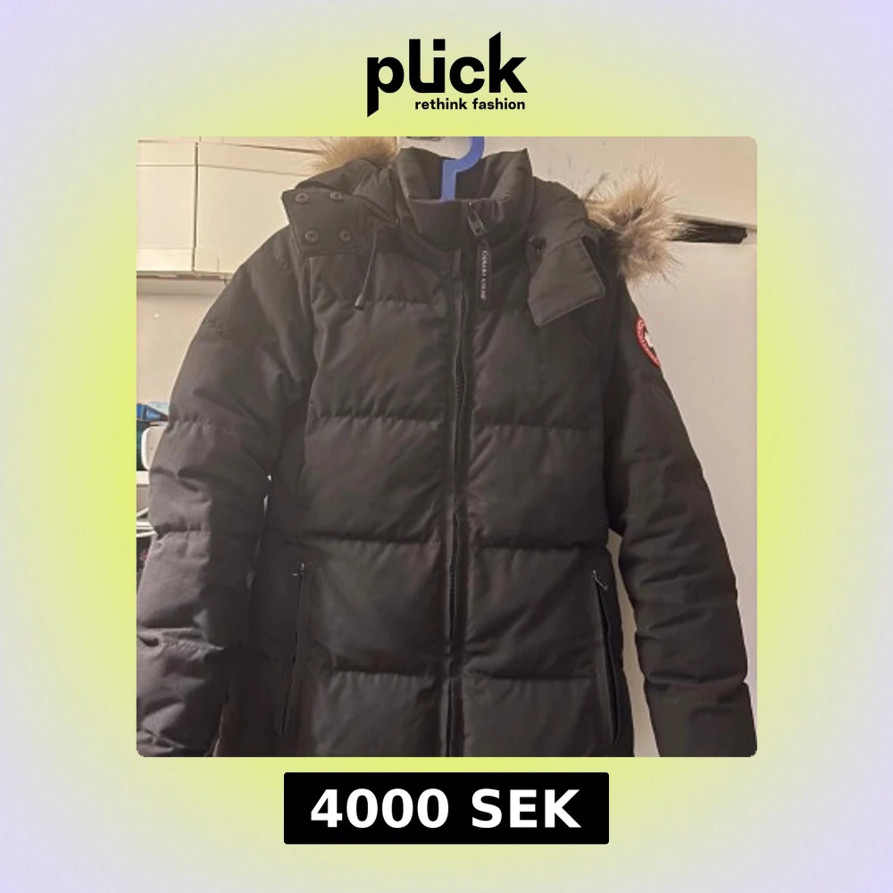 Säljer en svart dunjacka från Canada Goose med pälsdetaljer på huvan. Jackan har en dragkedja framtill och är långärmad. Perfekt för kalla vinterdagar med sin varma och skyddande design. Märkets logga syns tydligt på ärmen.