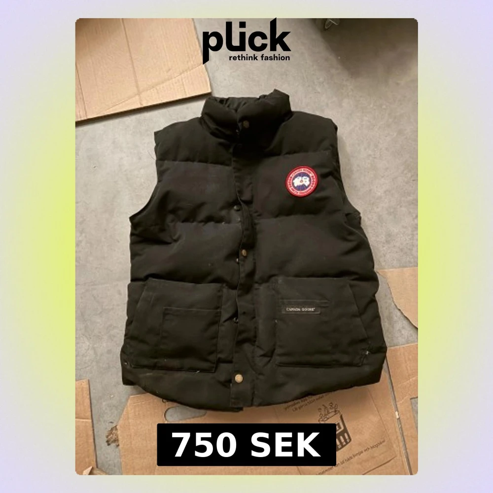 Svart dunväst från Canada Goose med hög krage, två stora fickor framtill och klassisk logopatch på bröstet. Västen har tryckknappar och är quiltad för extra värme. Perfekt för kalla dagar och har en clean, stilren look. Två knappar saknas