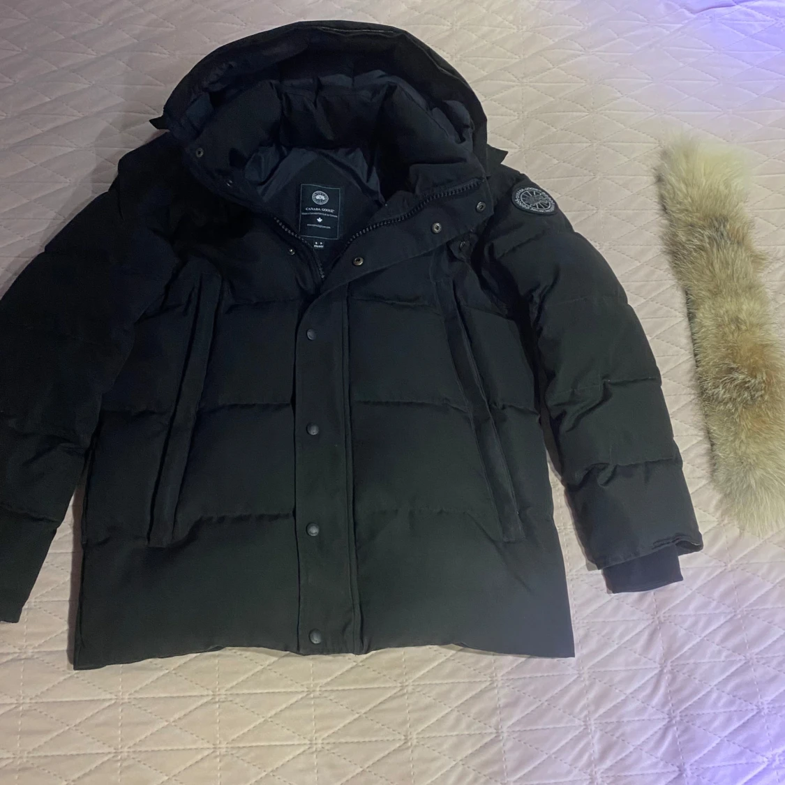Säljer en svart dunjacka av canada goose wyndham parks i black label i mycket bra skick. Man kan ta bort och sätta på pälsen. Den har 6 fickor och varm för kalla vinter dagar. Den är i storlek S men kan passa M också. DEN ÄR ÄKTA!!!