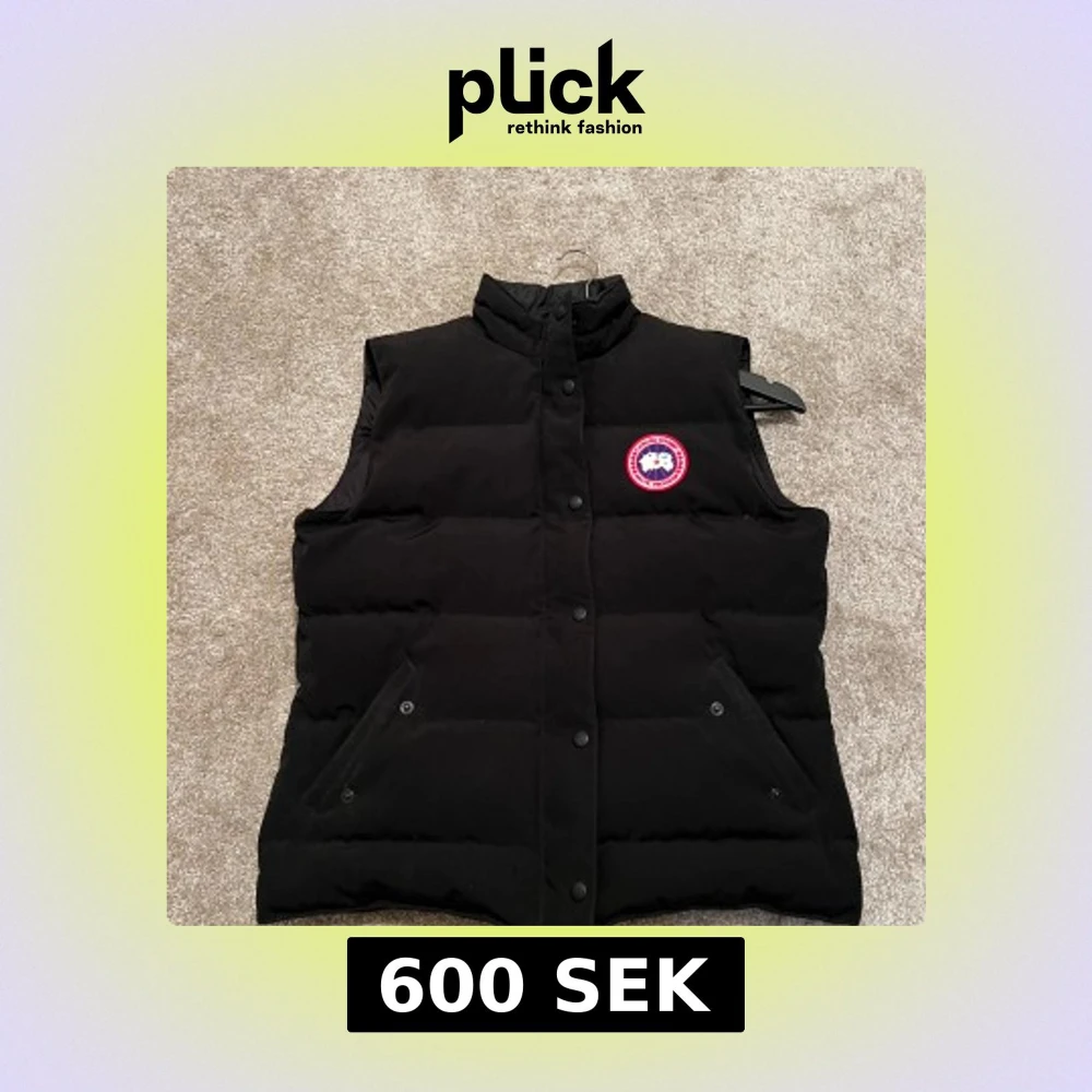 Svart dunväst från Canada Goose med klassisk logga på bröstet. Västen har hög krage, tryckknappar framtill och två snedställda fickor. Perfekt för lager-på-lager och riktigt snygg till streetwear eller outdoor-stil.
