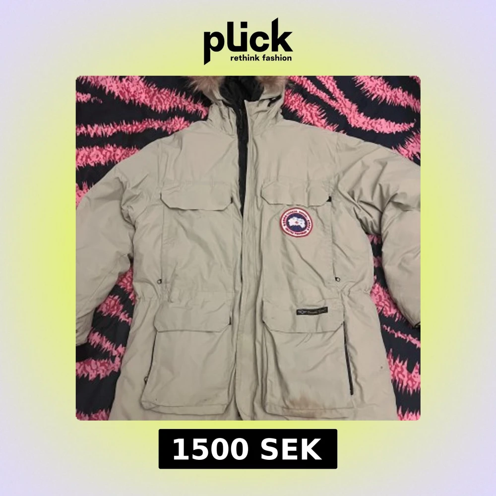 Säljer en beige parkas från Canada Goose med ikonisk röd och vit patch på bröstet. Jackan har stor huva med päls, flera praktiska fickor och dragkedja framtill. Perfekt för kalla vinterdagar och har en klassisk, oversized look.