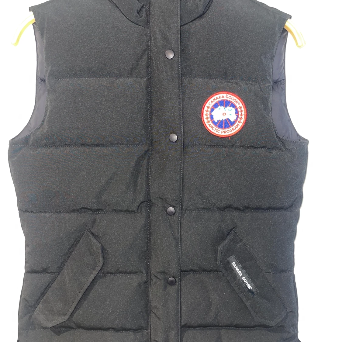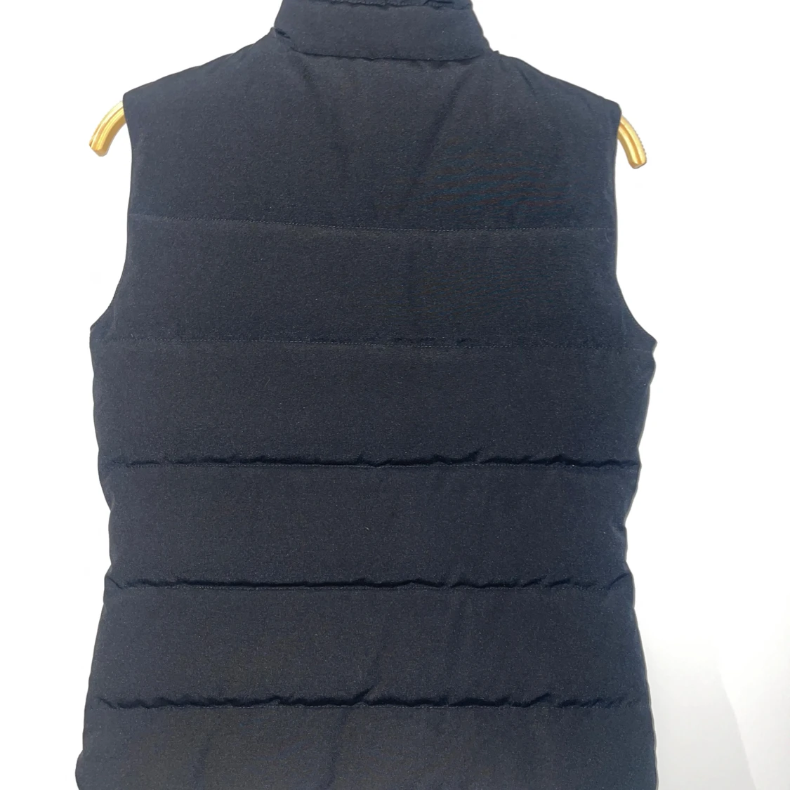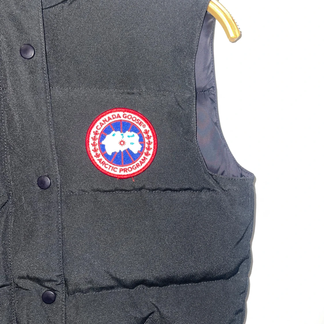 Svart dunväst från Canada Goose med hög krage och klassisk logga på bröstet. Västen har två snedställda fickor med knappar och stängs med både dragkedja och tryckknappar. Perfekt för lager-på-lager under kyliga dagar. Obs den är ny!