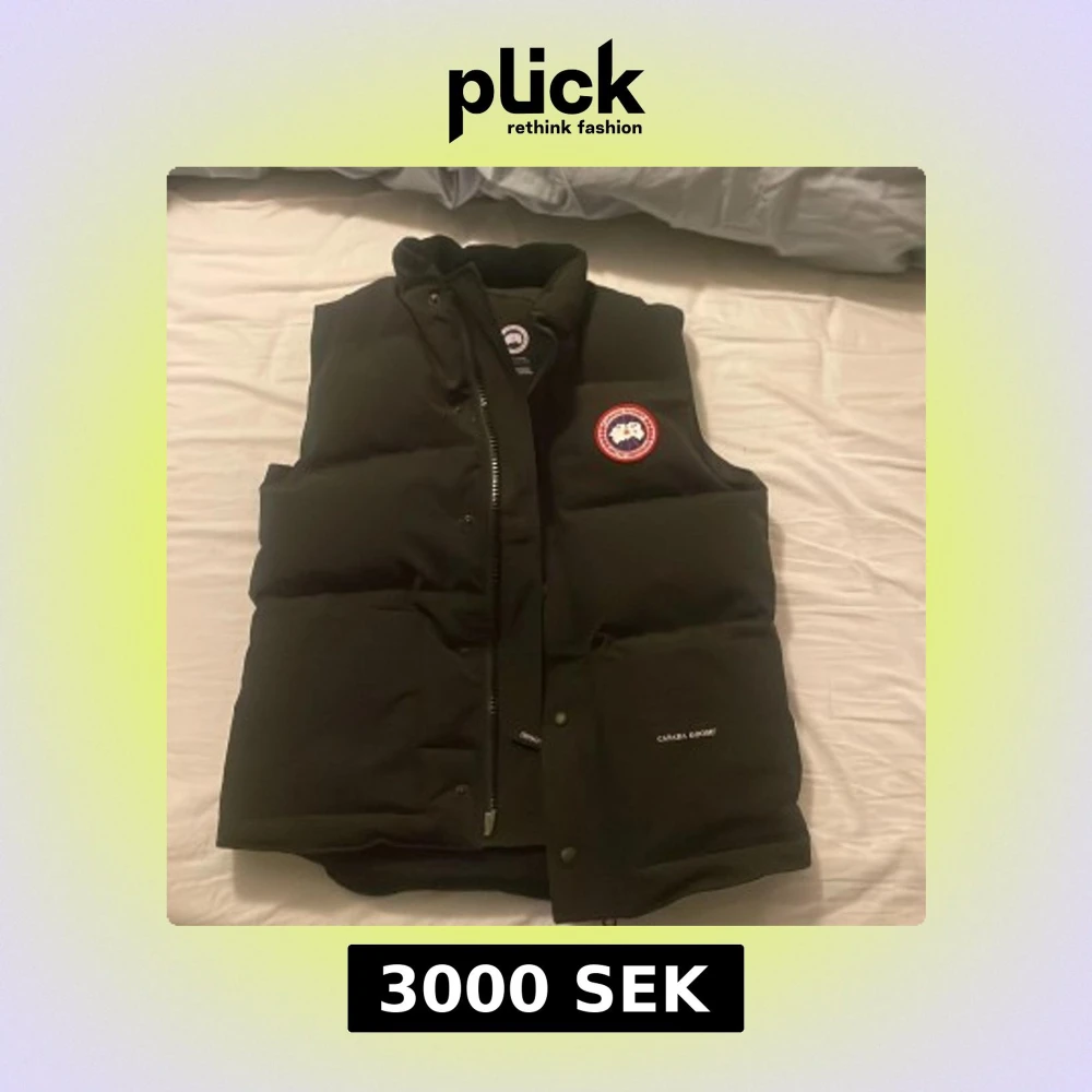 Säljer en svart dunväst från Canada Goose med broderad logga på bröstet. Västen har dragkedja och knappar framtill, perfekt för kyliga dagar. Den är tillverkad i canada goose och har en stilren design. Har aldrig andvänds är som ny