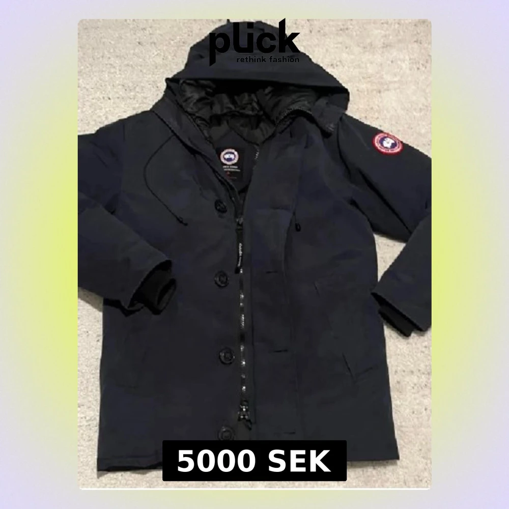 Säljer en navy dunjacka från Canada Goose i storlek XS. Jackan har huva, dragkedja och knappar framtill, samt klassisk logga på ärmen och broderad patch på ryggen. Insidan är quiltad och fodrad med dun för extra värme. Perfekt för kalla dagar.