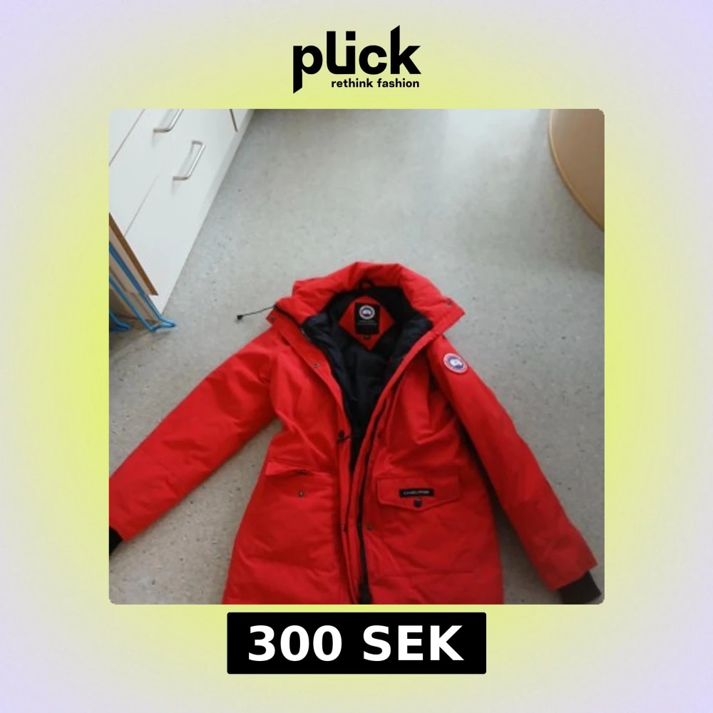 Säljer en röd dunjacka från Canada Goose med huva och svarta detaljer. Jackan har lång ärm, dragkedja och knappar framtill samt flera fickor. Perfekt för kalla dagar och riktigt varm.
