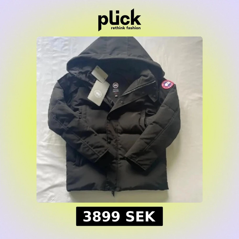 Snygg svart dunjacka från CanadGoose med huva och klassisk logga på ärmen. Jackan är quiltad och har knappar framtill. Perfekt för kalla dagar när du vill hålla stilen och värmen.