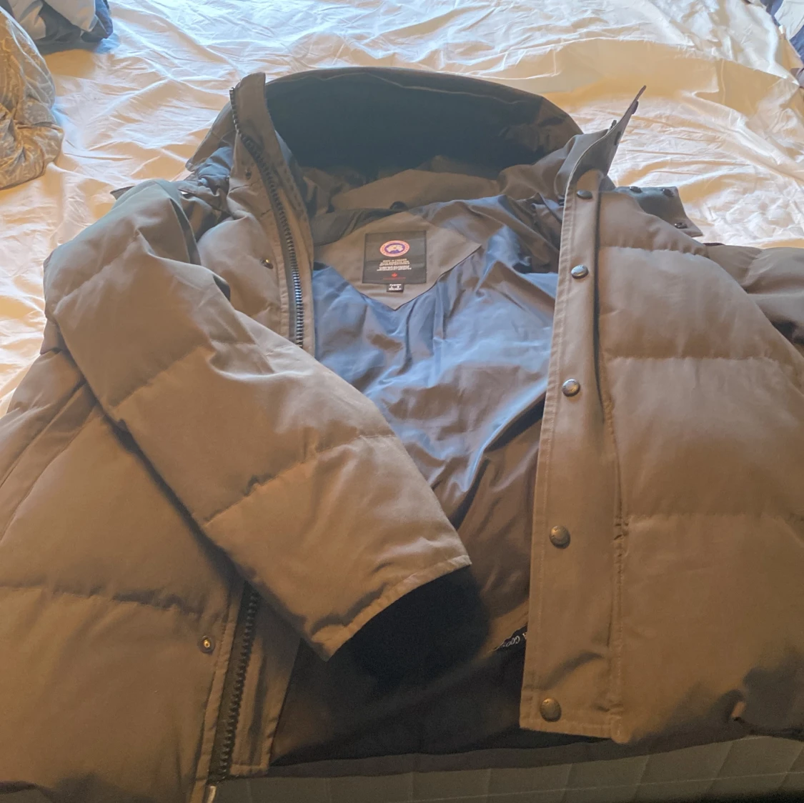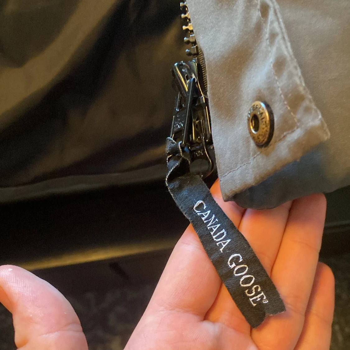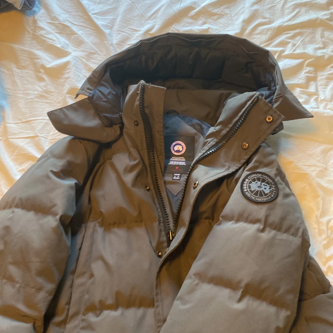Säljer en ljusgrå dunjacka från Canada Goose med hög krage och huva. Jackan har lång ärm, dragkedja och tryckknappar framtill samt klassisk patch på ärmen(black label). Perfekt för kalla dagar och riktigt varm. Utan päls eller dust bag. Pris kan diskuteras.
