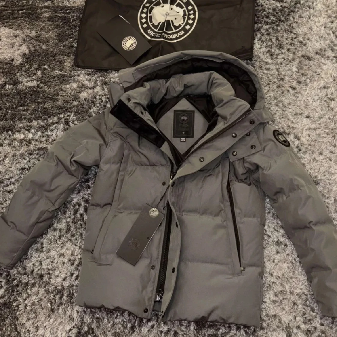 Snygg mörkgrå Canada Goose-jacka i storlek M med luva och svart loga på armen. Jackan har både dragkedja och knappar framtill för extra skydd mot kylan. Stilren och varm – perfekt för kalla dagar när du vill hålla stilen och hålla dig bekväm. Svarar alltid alla meddelanden direkt och fraktar alltid samma dag som köp:)
