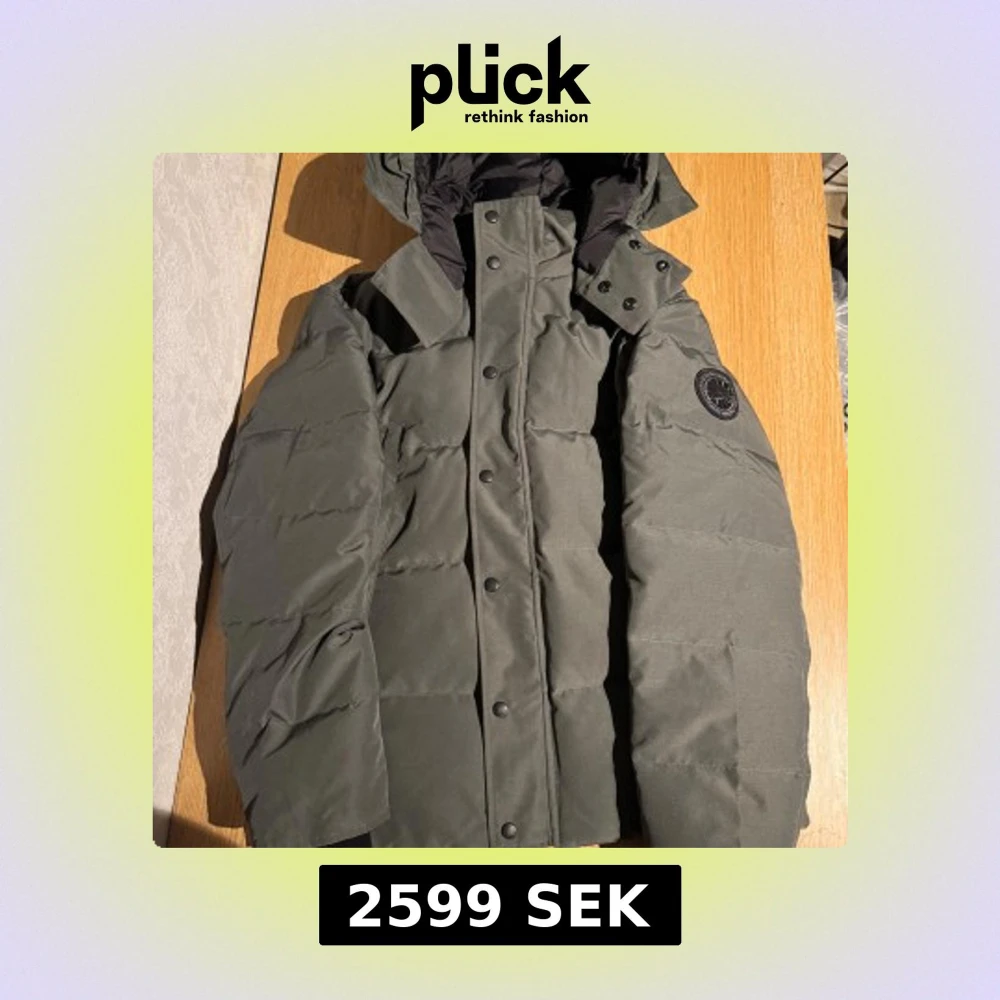 mörkgrå pufferjacka från Canada Goose med huva och svart logotyp-patch på ärmen. Jackan har knappar och dragkedja framtill, quiltad design och är fodrad med svart innerfoder.