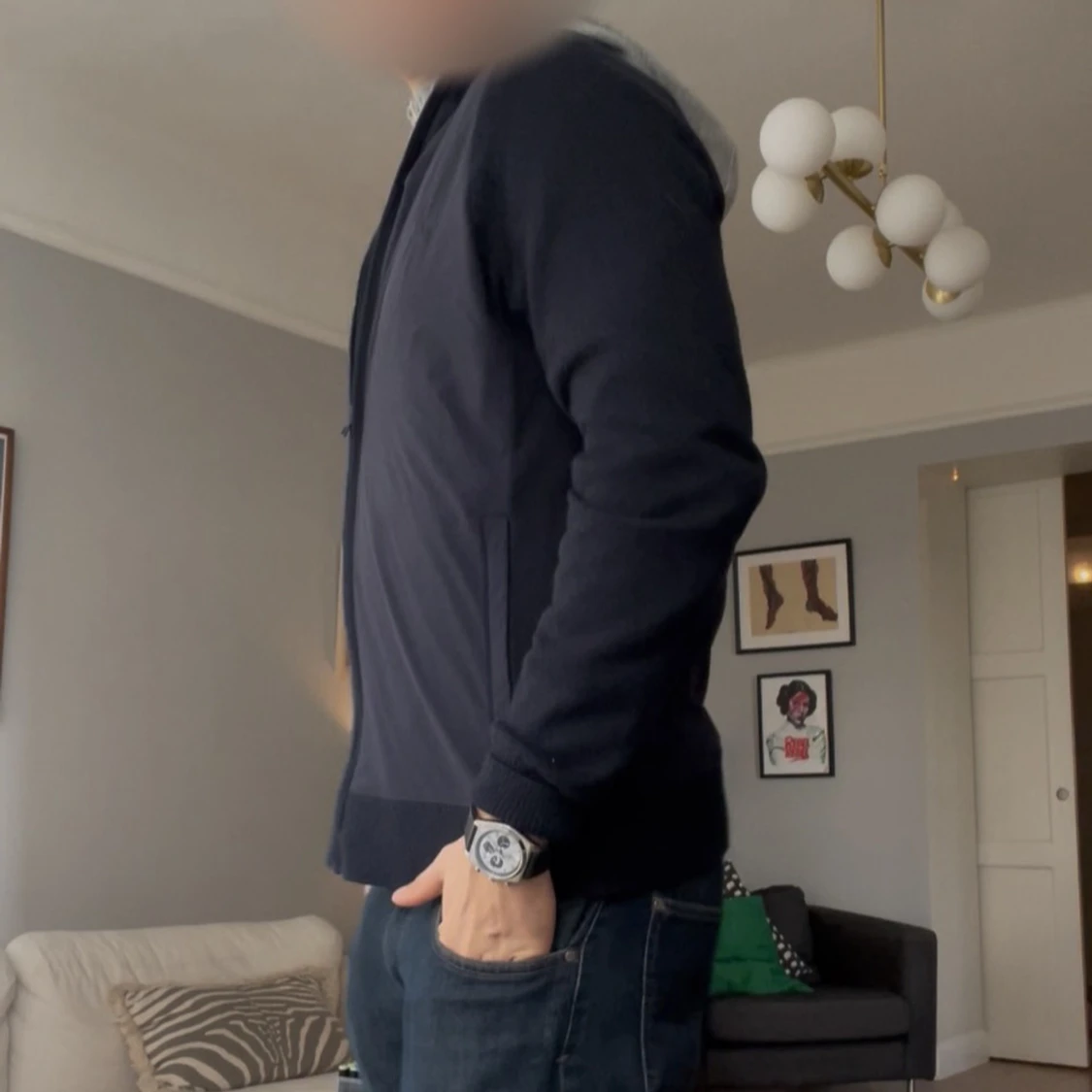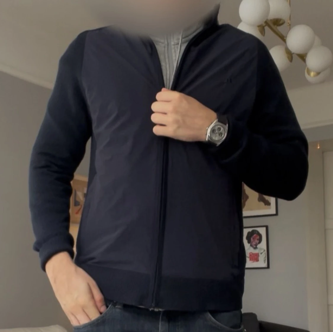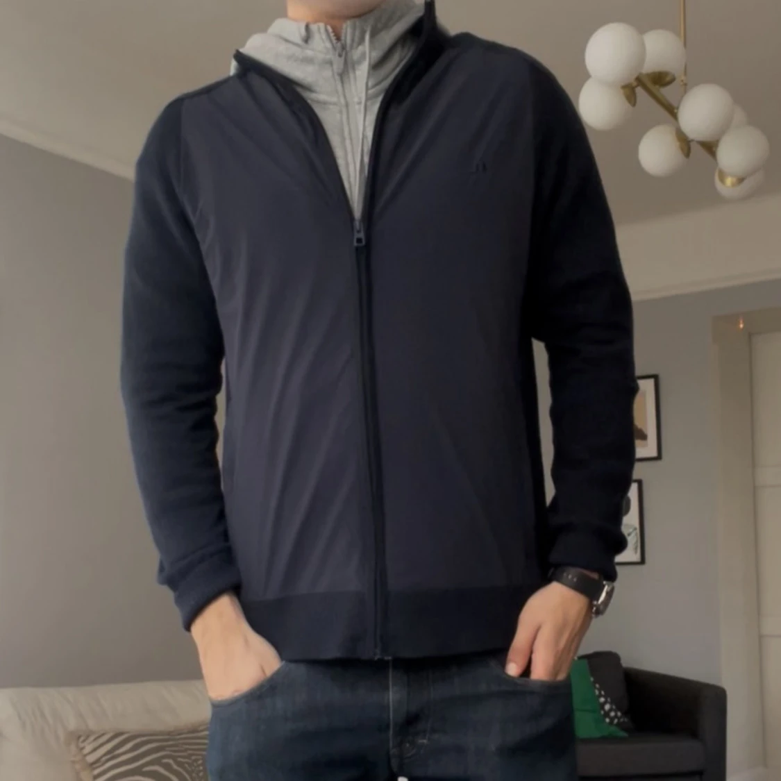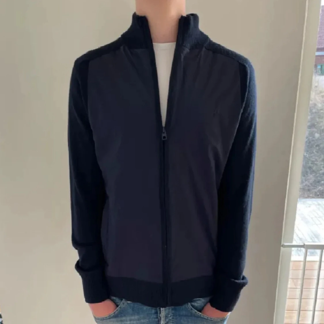 Jacka/cardigan - Jlindeberg - med märket broderat på bröstet - marinblå - modellerna är 184 och väger 70kg+-, sitter bra på olila kroppstyper med andra ord - Nypris 1799 - jävligt snygg casual eller mer dressed med en skjorta under och halfzip