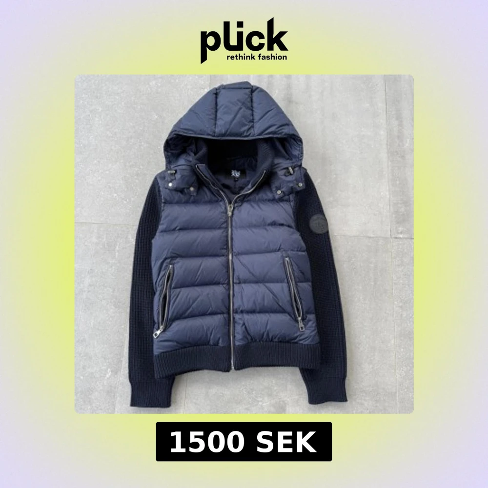 Mörkblå cardigan jacka med huva - Snygg mörkblå pufferjacka med quiltad framsida och mjuka stickade ärmar. Jackan har huva med snörning och dragkedja framtill. Perfekt för dig som vill ha en chill och stilren look. Passar till jeans och sneakers.
