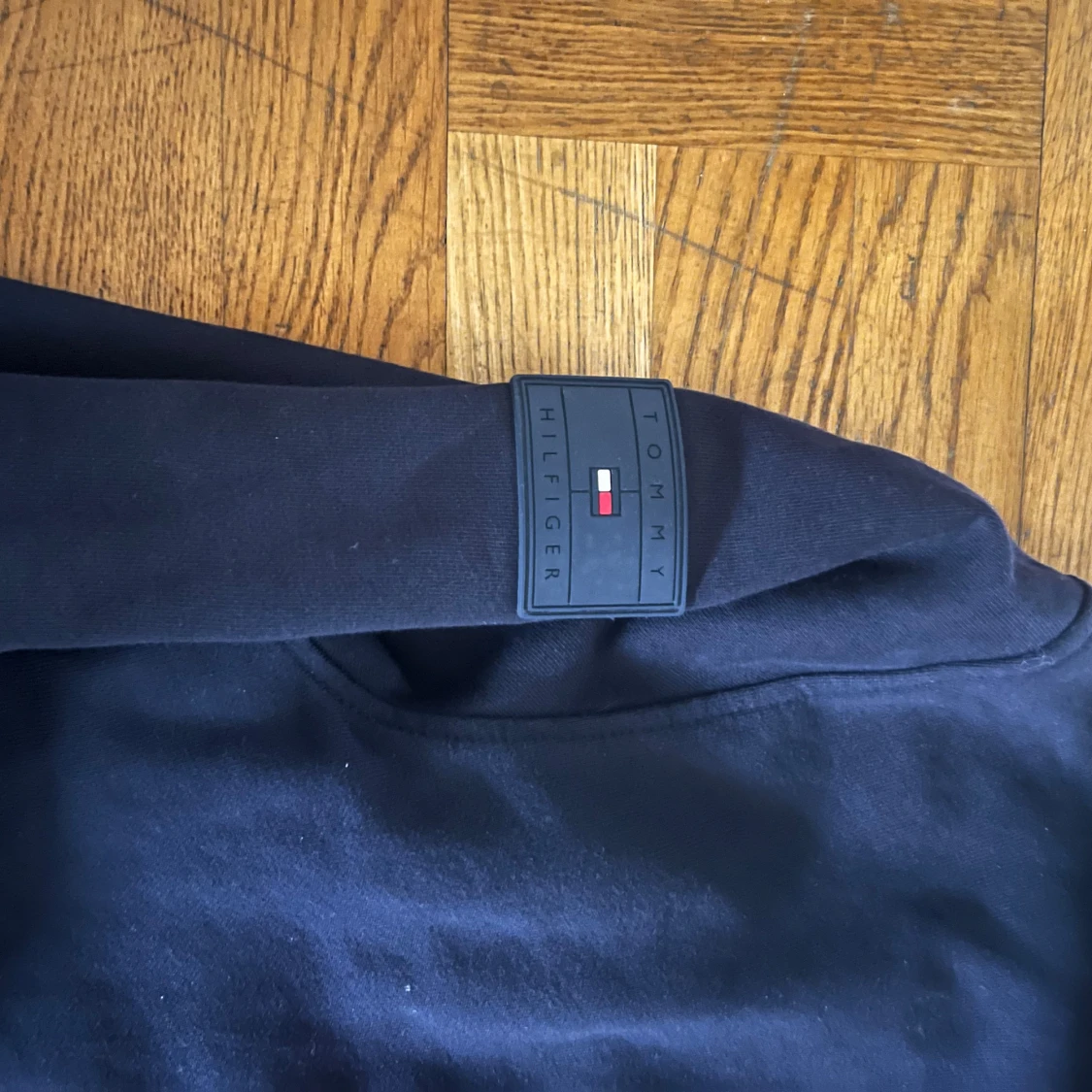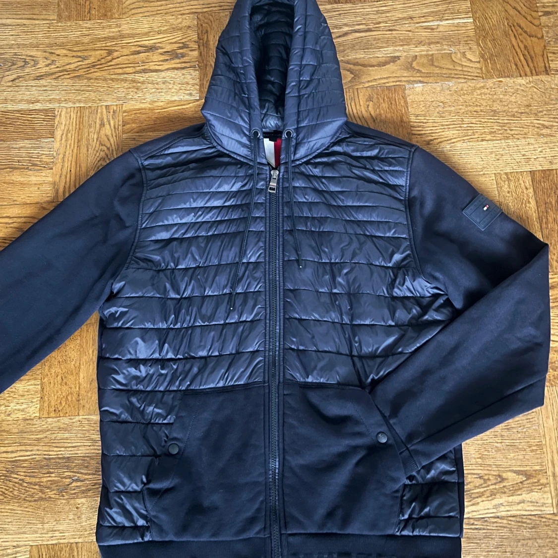 Mörkblå cardigan från Tommy Hilfiger med quiltad framsida och huva. Jackan har dragkedja, två fickor med knappstängning och ribbad nederkant med Hilfiger-logga. Materialmix av polyester och bomull, samt långärmad design med logotyp på ärmen. Storlek L. Nypris 2300kr mitt pris 800, kan gå ned i pris vid snabb affär!!