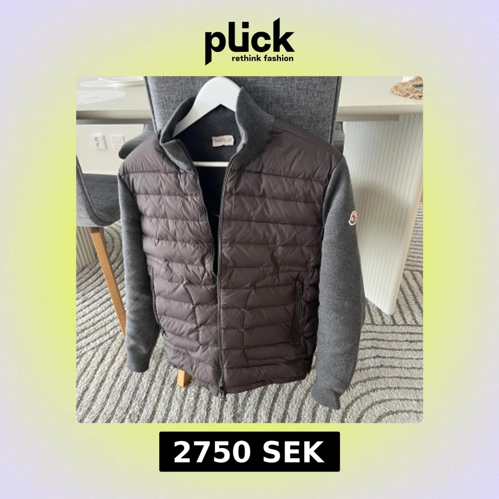 Snygg Cardigan från Moncler i mörkgrått med stickade ärmar och krage. Jackan har dragkedja framtill, Moncler-logga på ärmen och två sidofickor med zip. Perfekt för dig som vill ha en stilren och modern look. Stl M men passar som S.