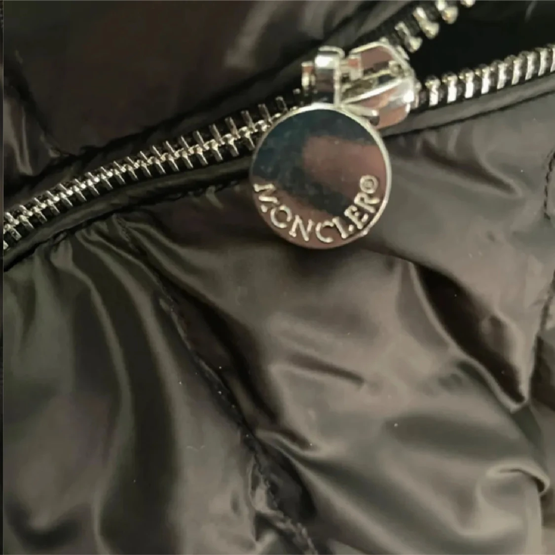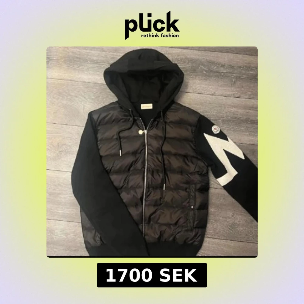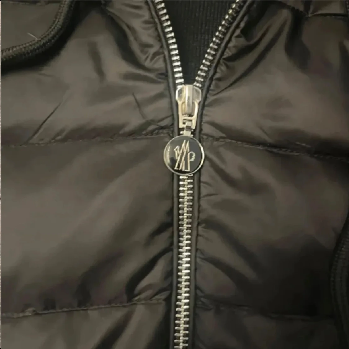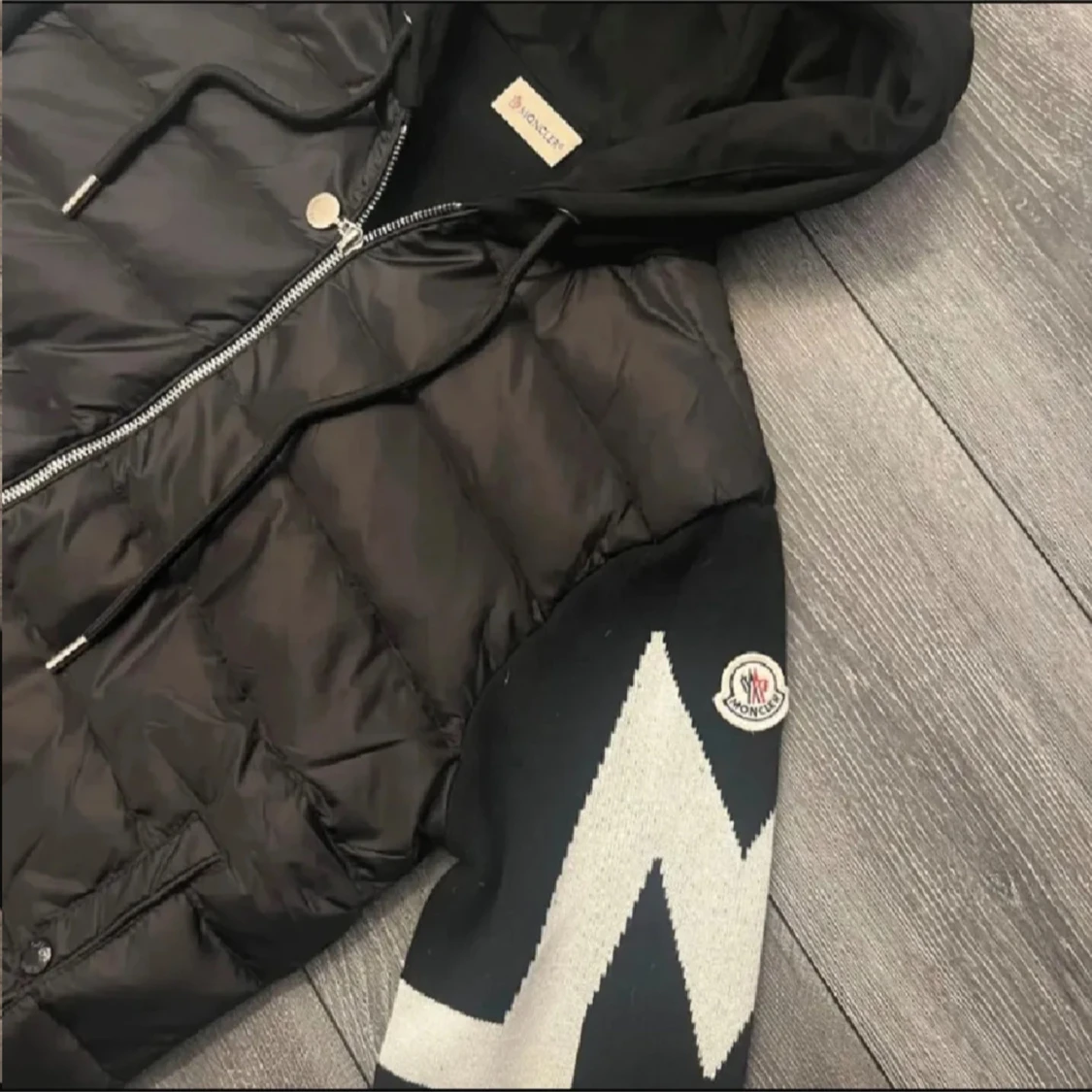 Svart pufferjacka från Moncler med huva och dragkedja framtill. Jackan har quiltad front i blankt syntetmaterial, stickade ärmar med vit zigzag-mönster och Moncler-logga på ena armen. Snygga detaljer som snörning vid huvan och silverfärgad dragkedja. Priset är inte hugget i sten kontakta vid intresse! Storlek L passar M också.