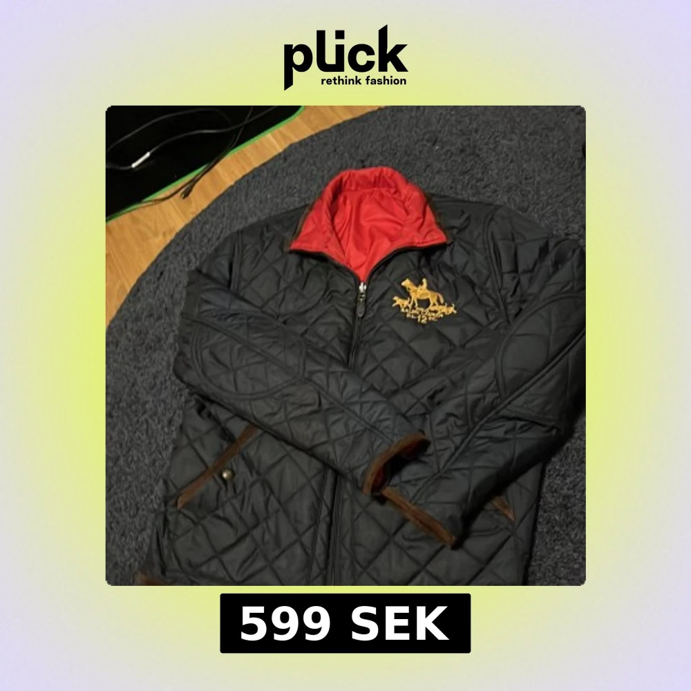 Snygg mörkblå quiltad jacka från Ralph Lauren med röd insida så den kan vändas ut och in om man fördrar röd jacka Perfekt för kyligare dagar med stil. Tar även byten.