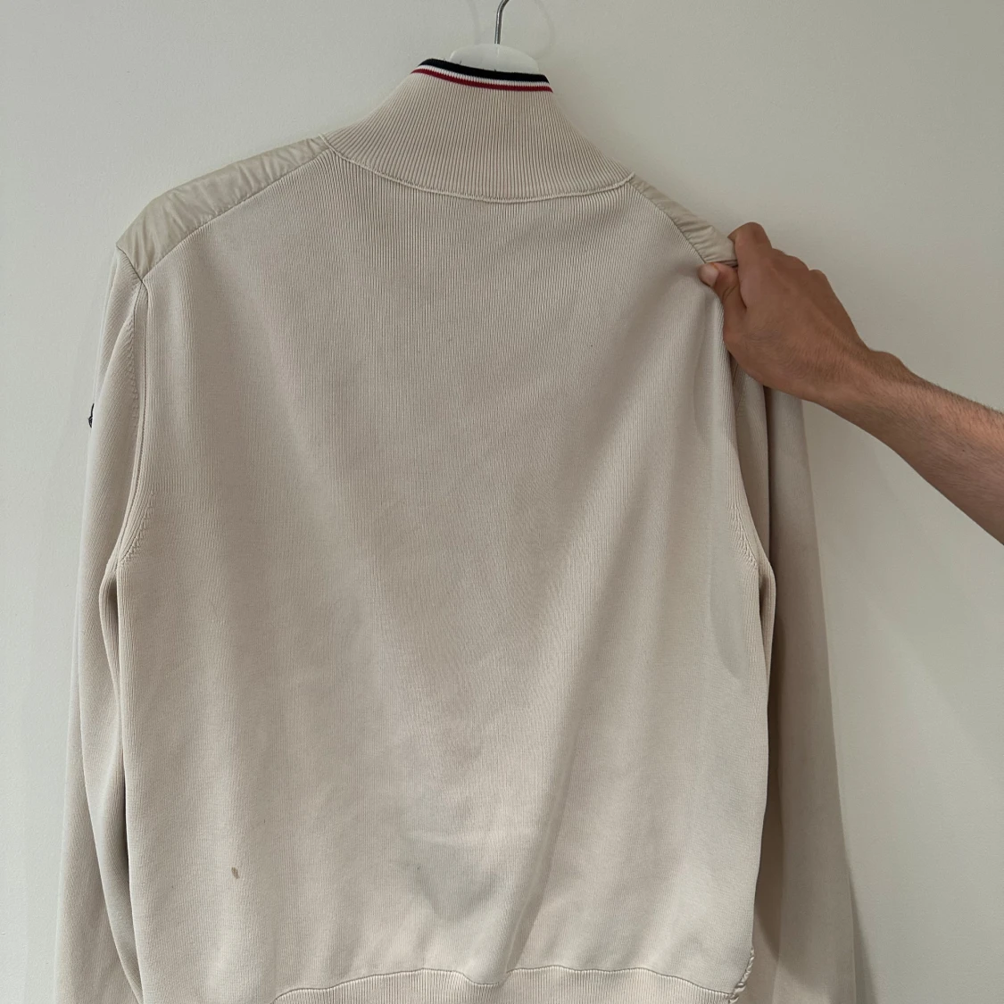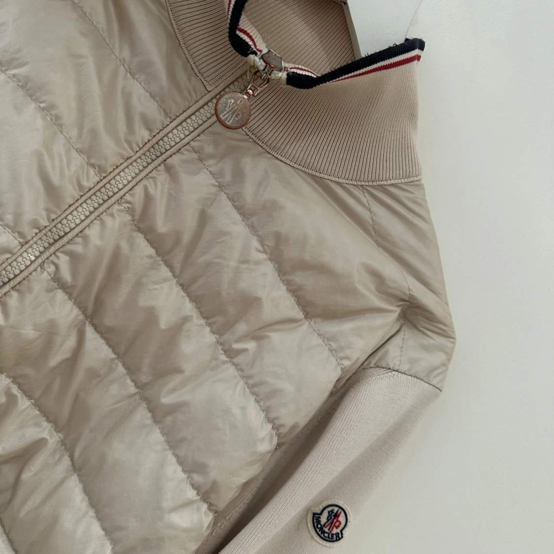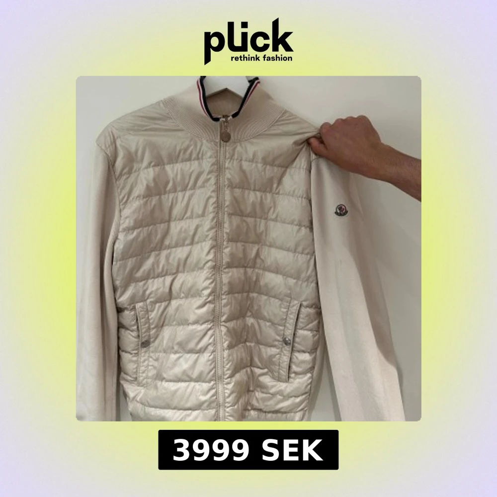 Snygg beige Cardigen jacka från Moncler med ribbad krage och ärmar. Jackan har dragkedja framtill, två fickor med tryckknappar och Moncler-logga på ärmen. Materialmix med polyester och bomull ger en stilren look. Det finns äktighetsbevis vid intresse så de bara att höra av sig!!