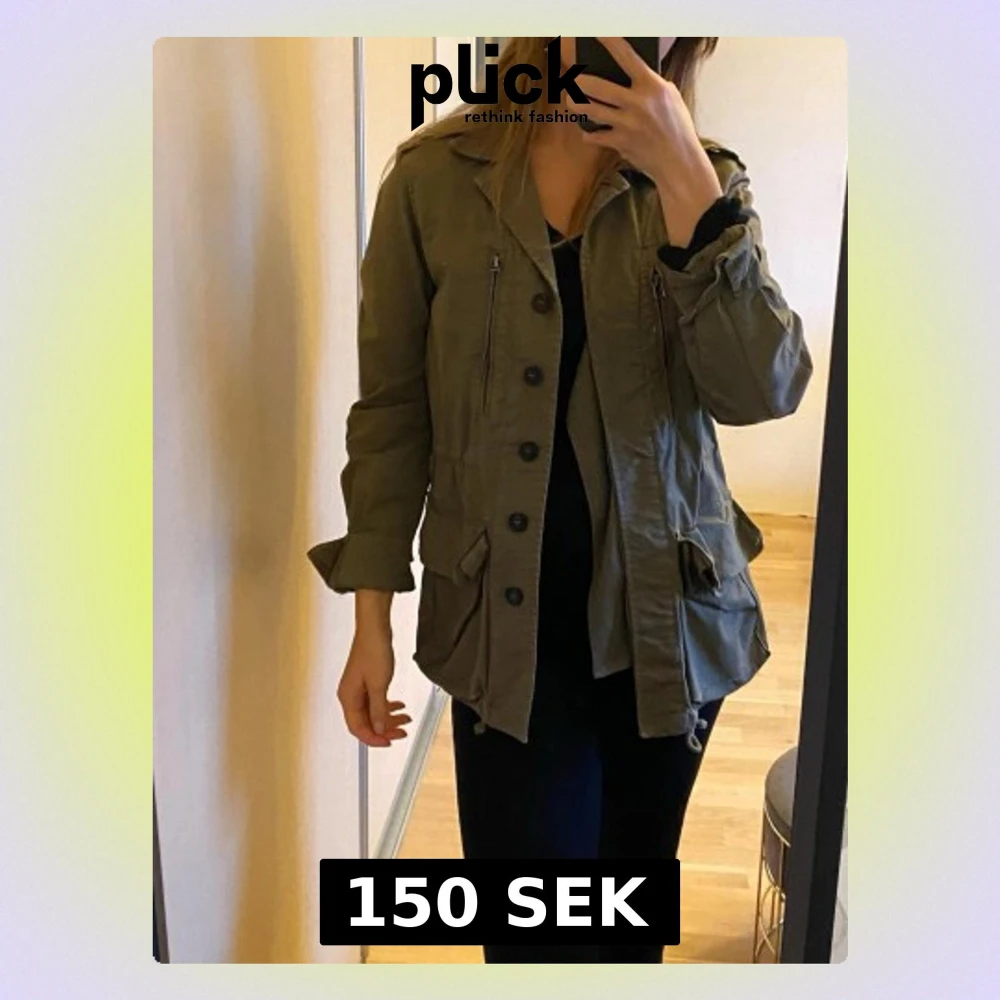 Mörkgrön ”militärjacka” /vårjacka/sommarjacka/jeansjacka dam Går att dra åt i midja och längs ner, knappar i ärmarna, jackan stängs med knappar. Många fickor Zara storlek S Inga större synliga skavanker, jackan har lätt sliten look sedan från början så svårt att säga vad som är slitage och vad som hör till, men den har inga tydliga defekter/fel :)