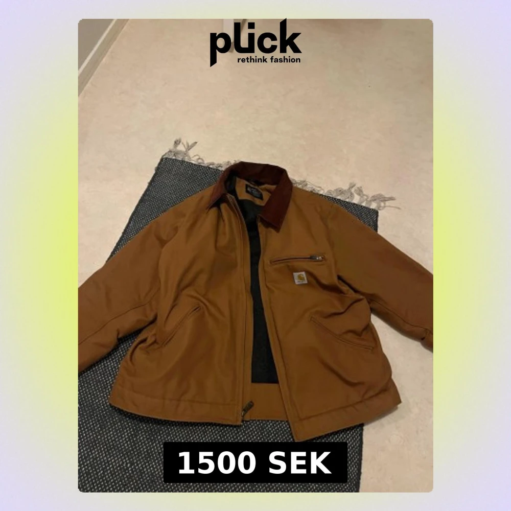 Säljer en oanvänd brun Carhartt jacka med mörkbrun manchesterkrage och dragkedja framtill. Jackan har flera fickor, inklusive en bröstficka med dragkedja och Carhartt-logga. Insidan är fodrad för värme och passformen är relaxed fit.