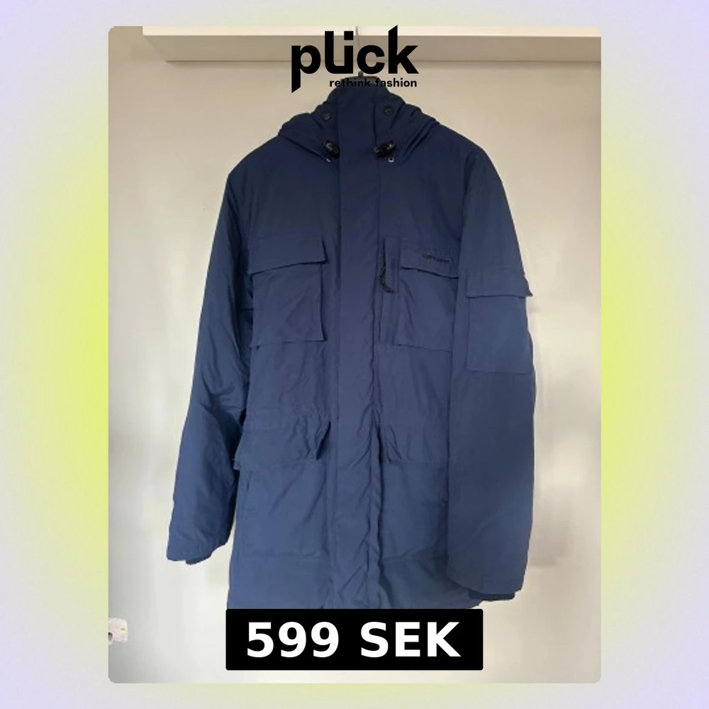 Säljer en mörkblå parkas från Carhartt med huva strl M. Flera stora fickor framtill. Jackan har snygga detaljer som metallknappar med logga och dragsko vid halsen. Lite slitage på knappar. Använt fint skick.