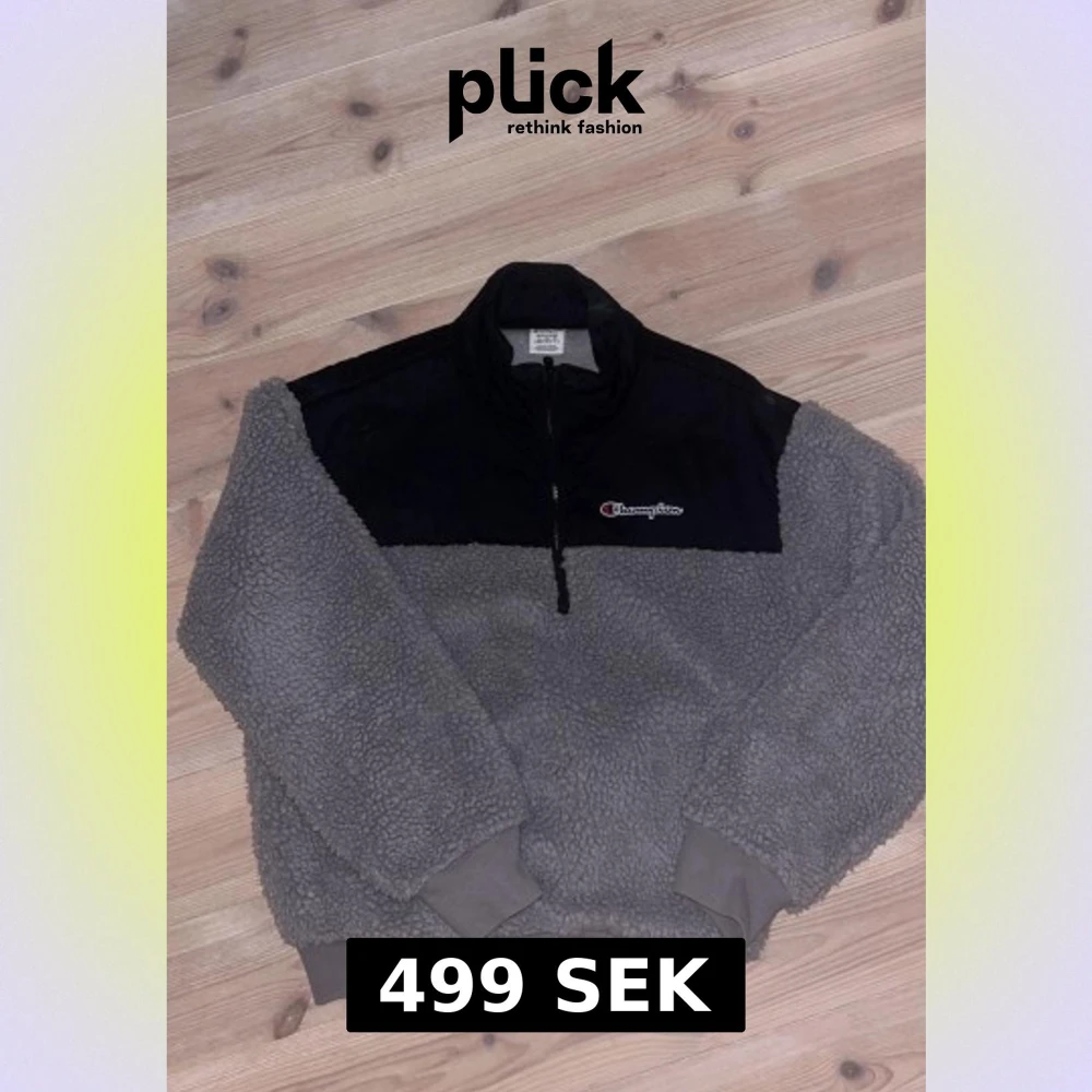 Säljer en grå och svart fleece-tröja från Champion i storlek medium. Tröjan har en mysig teddystruktur, svart panel upptill med broderad Champion-logga och praktisk half zip framtill. Perfekt för kyliga dagar och chill outfits.