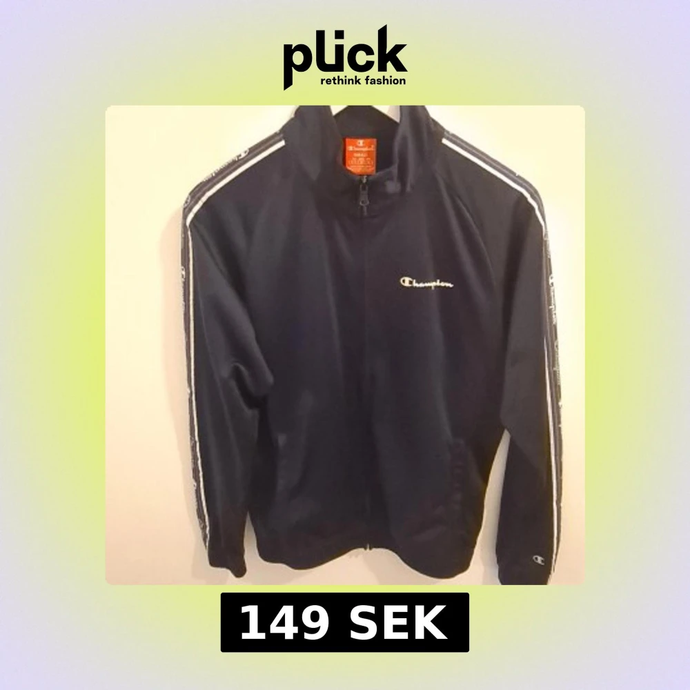 Snygg mörkblå track jacket från Champion med vit logga broderad på bröstet och loggor längs ärmarna. Jackan har dragkedja framtill, ståkrage och två fickor. Tillverkad i glansig polyester för en sportig vibe.