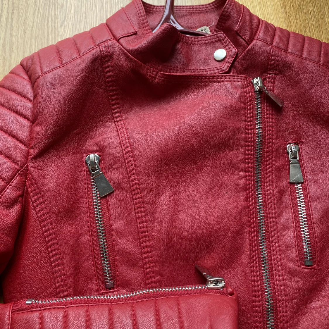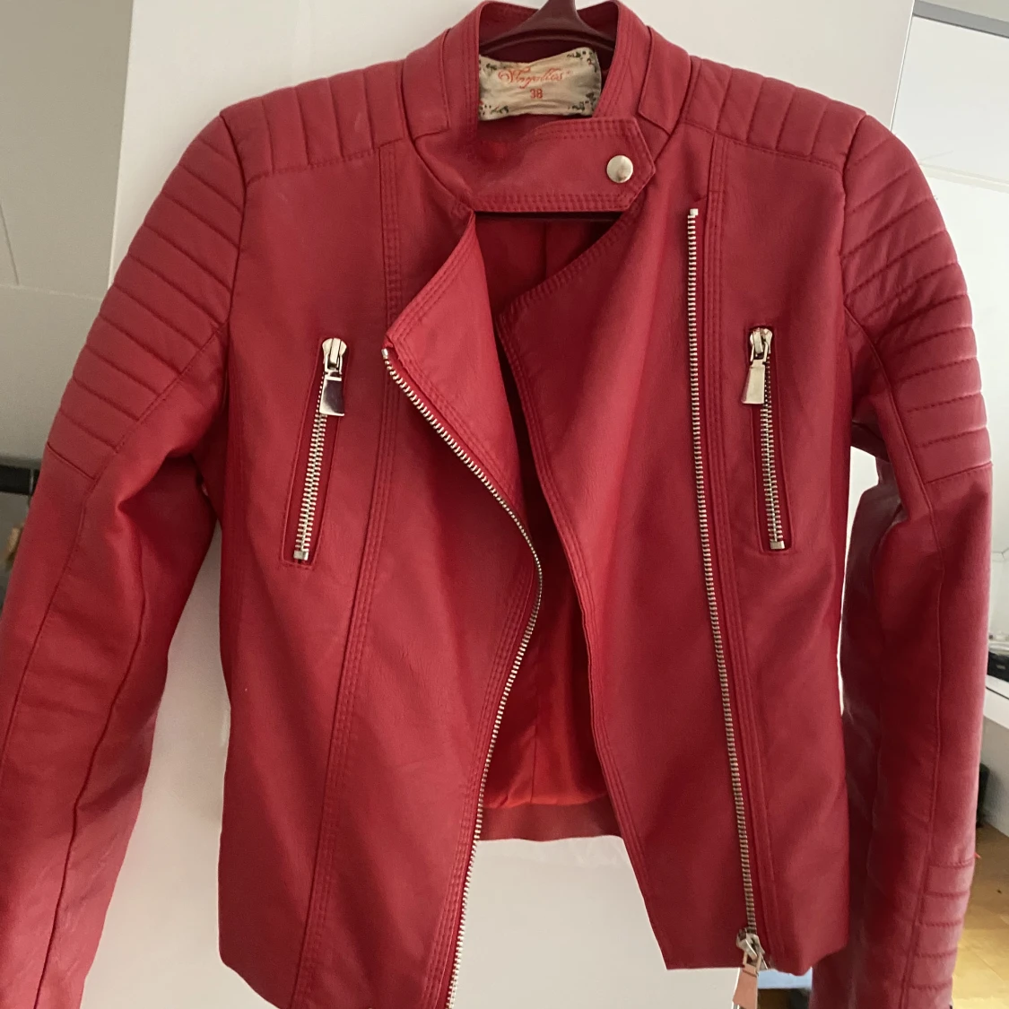 Röd skinnjacka (vegan) från Chiquelle i mycket bra skick. Nypris 700kr, slutsåld på Chiquelle. Storlek 38. Skriv gärna för fler bilder