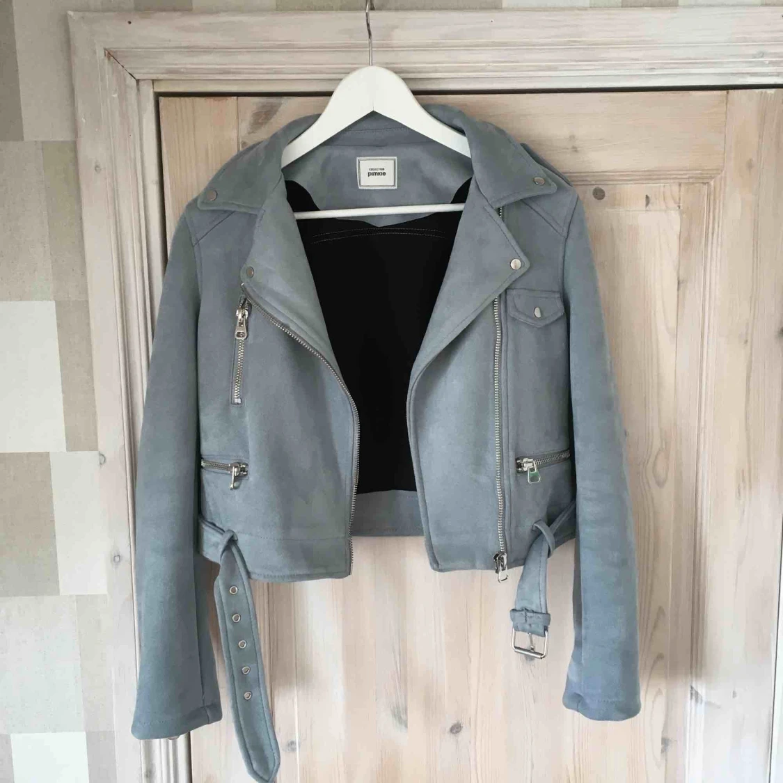 Skitsnygg mocka-bikerjacka i en super passform. Använd fåtal gånger. Fått flertal komplimanger när jag burit den men säljs pga används för sällan. Passar M också.