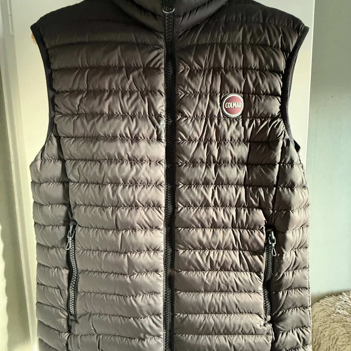 Snygg grå dunväst från Colmar med horisontella sömmar och hög krage. Västen har två fickor med dragkedja och en diskret logga på bröstet. Perfekt att slänga över en hoodie eller tröja när det är kyligt ute.