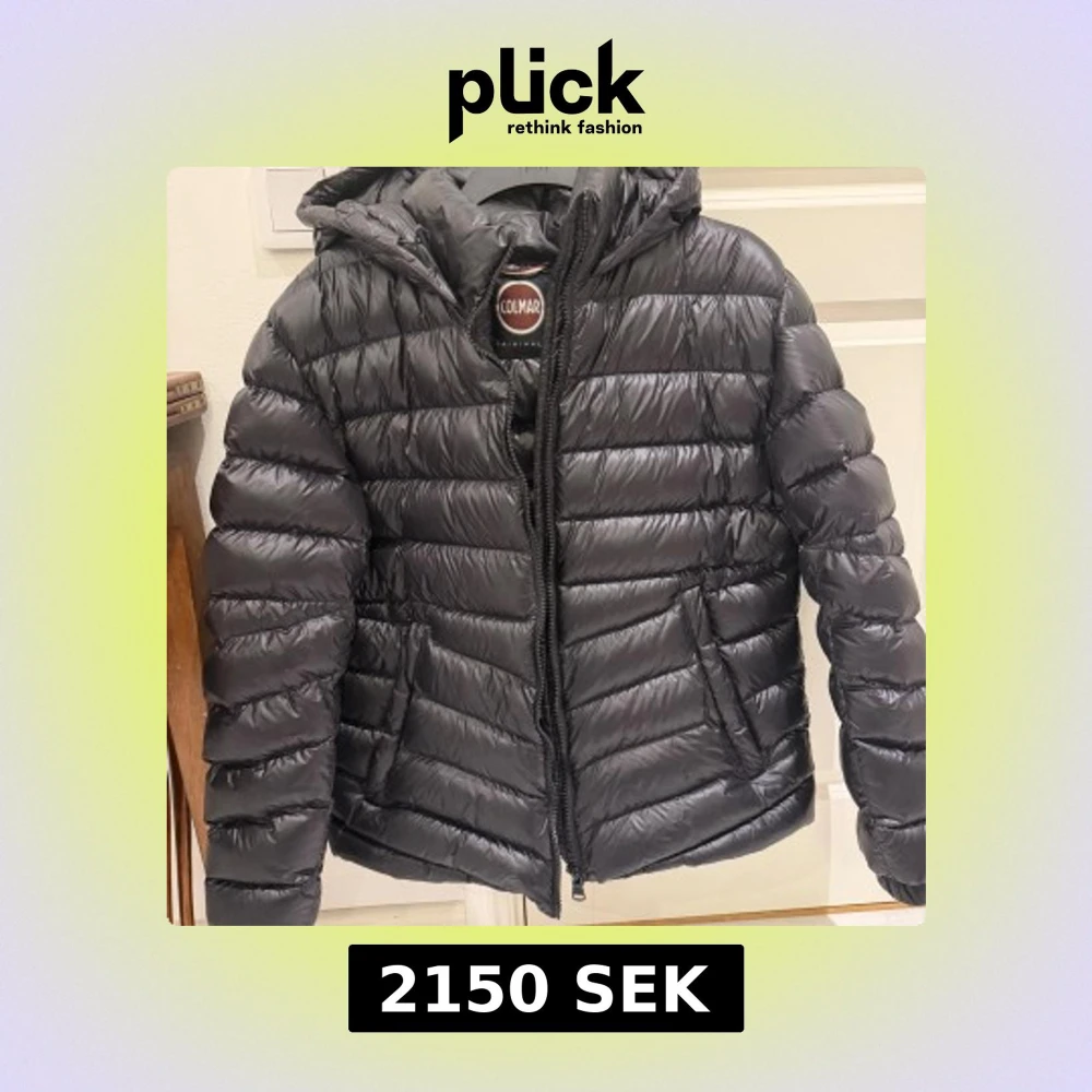 Svart dunjacka från Colmar med huva. Jackan har dragkedja framtill, två sidofickor och en snygg, glansig finish. Perfekt för kalla dagar. Mycket liten reva på framsida som knappt syns. Annars helt i nyskick!!