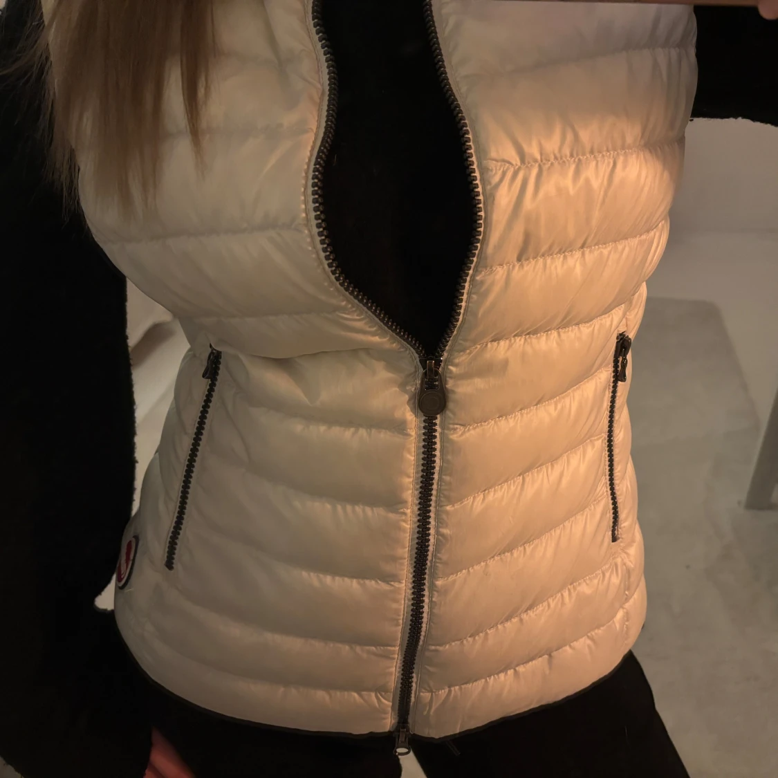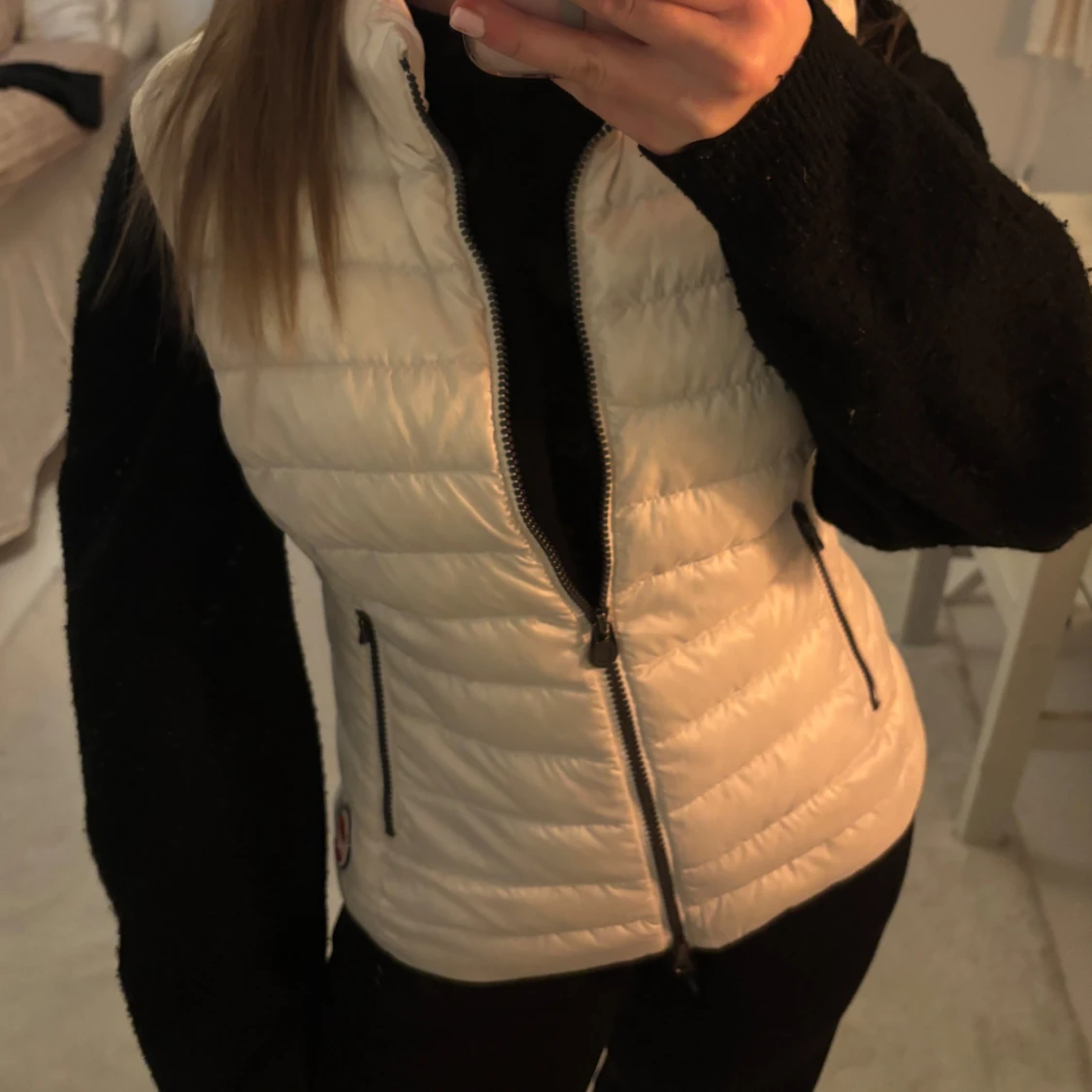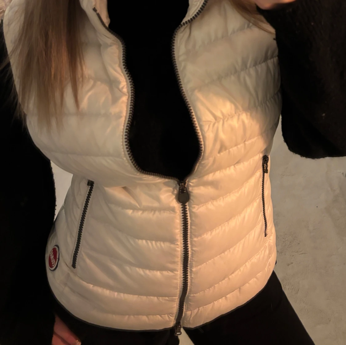 Snygg vit dunväst med dragkedja framtill och två praktiska fickor med dragkedjor. Perfekt för lager-på-lager under kyligare dagar. storlek 44 men som en S,xs