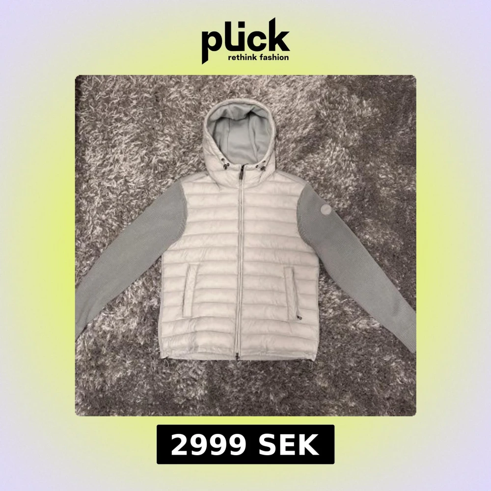 Snygg ljusgrå cardigan från Colmar med stickade ärmar och vadderad kropp. Jackan har huva med snörning, två fickor med dragkedja och Colmar-logga på ärmen. Oanvänd och helt nytt skick.