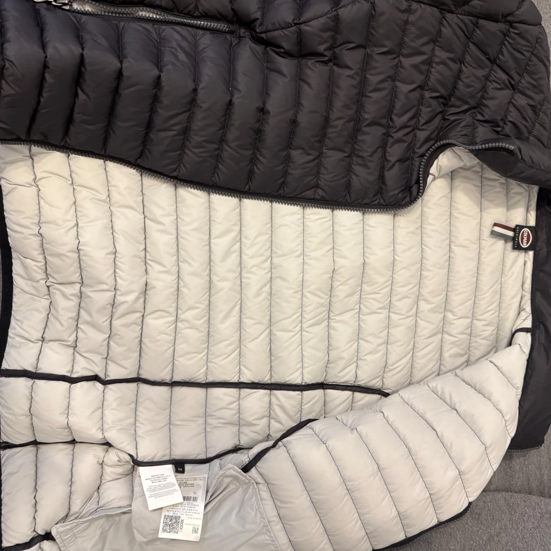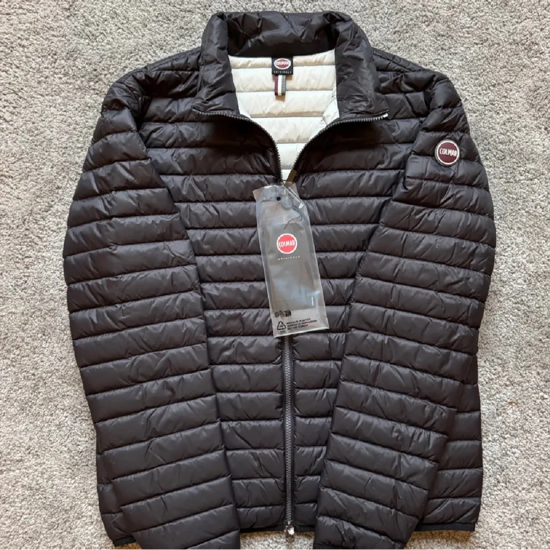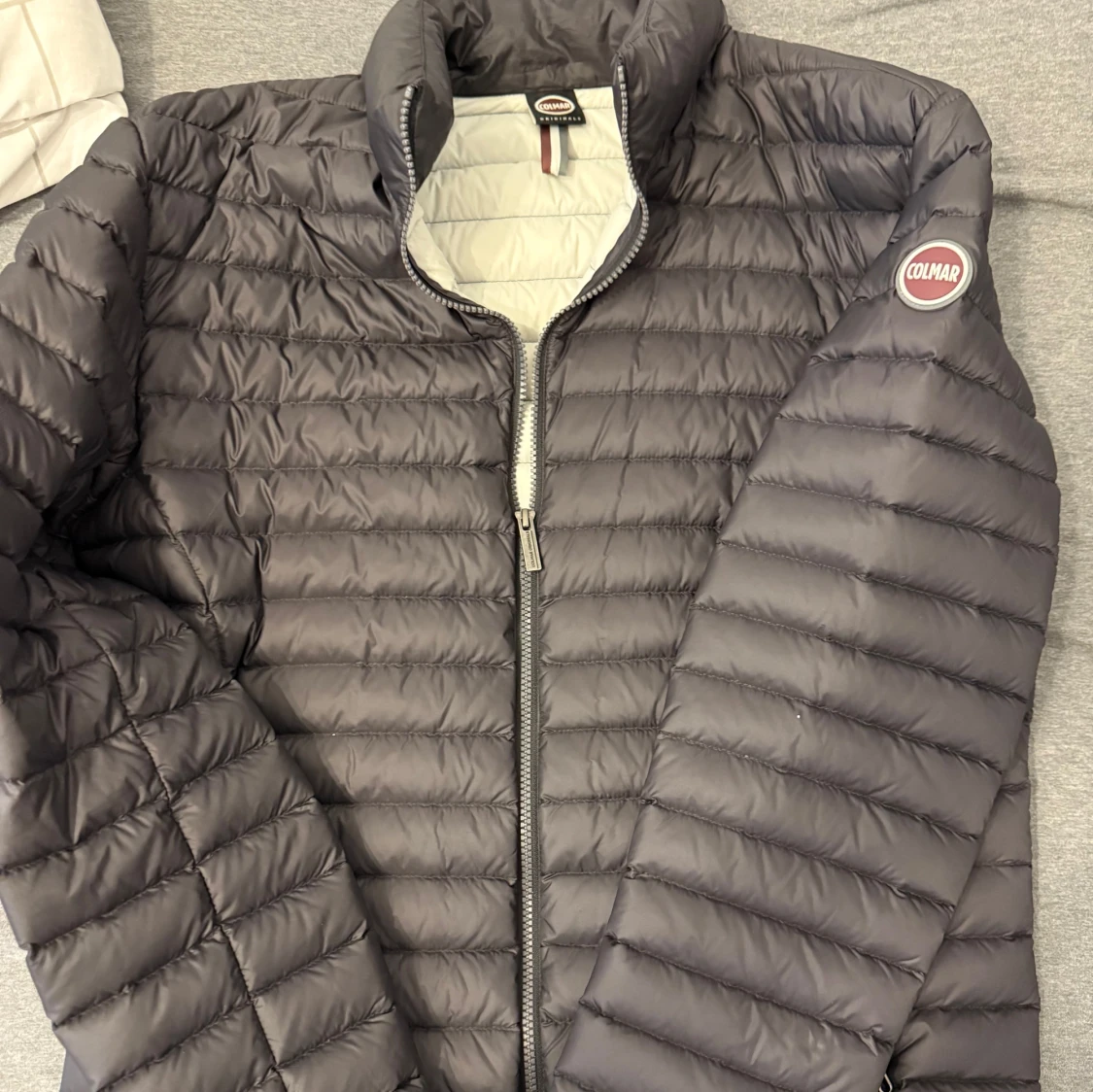 Snygg svart dunjacka från Colmar med quiltad design och dragkedja framtill. Jackan har en stilren ståkrage och insidan är ljusgrå. Perfekt för dig som vill ha en lätt och varm jacka med modern look. Colmar-logga på ärmen ger extra streetkänsla. Storlek L men passar som M mer