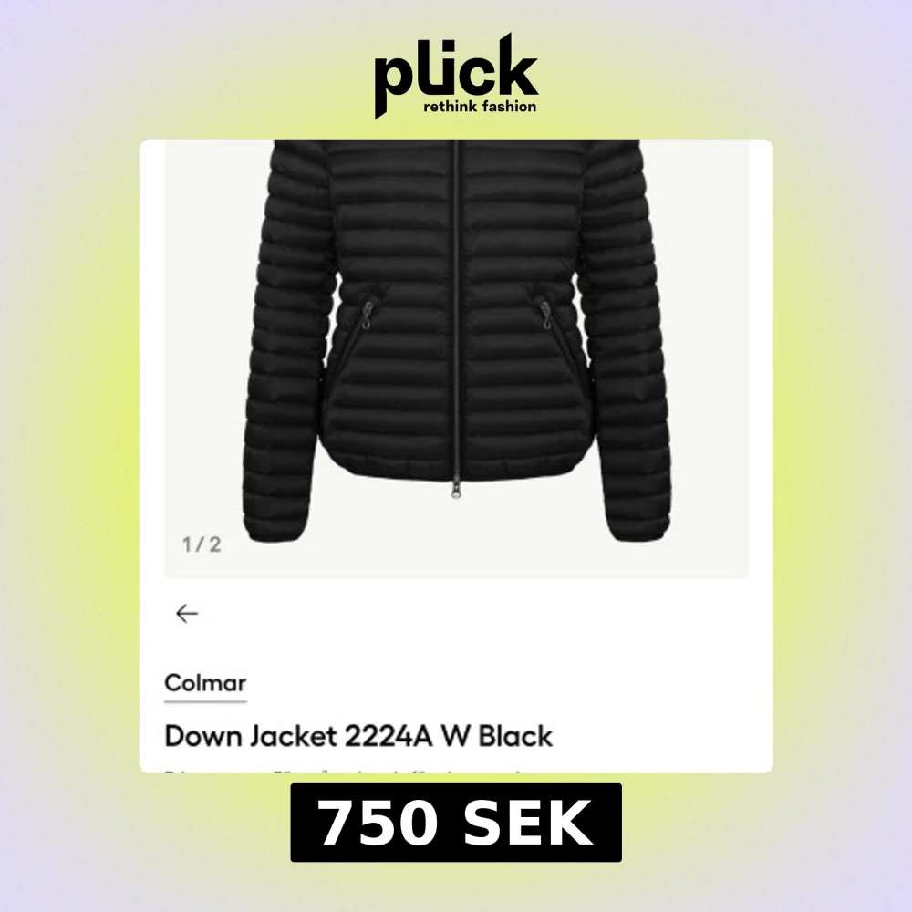 Säljer en svart dunjacka från Colmar med huva och dragkedja framtill. Jackan har två snedställda fickor med dragkedja och ett diskret Colmar-märke på ärmen. Den är lätt, quiltad och perfekt för kyliga dagar.