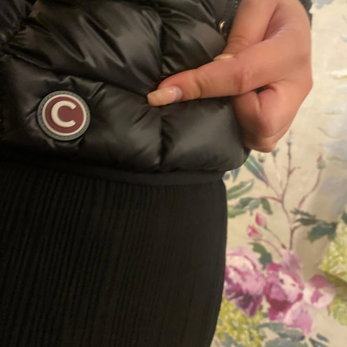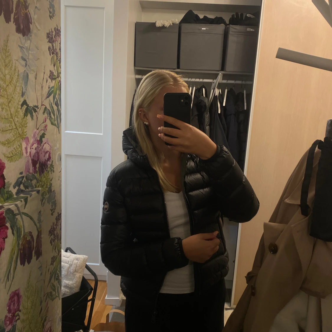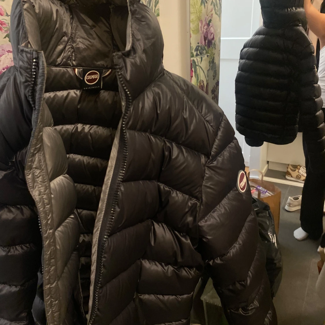 Säljer en svart, glansig dunjacka från Colmar med huva och dragkedja. Jackan har en puffig look, lång ärm och klassisk logga på ärmen. Perfekt för kalla dagar och riktigt snygg till streetwear-stil.