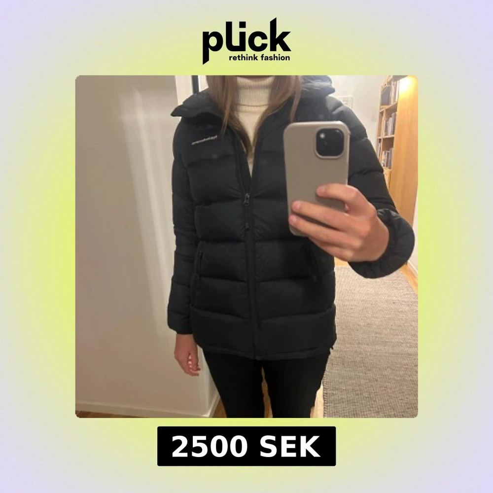 Säljer en svart pufferjacka från Peak Performance med hög krage och dragkedja framtill. Jackan har två sidofickor med dragkedja och en stilren, quiltad design. Perfekt för kalla dagar och riktigt snygg till både jeans och boots.