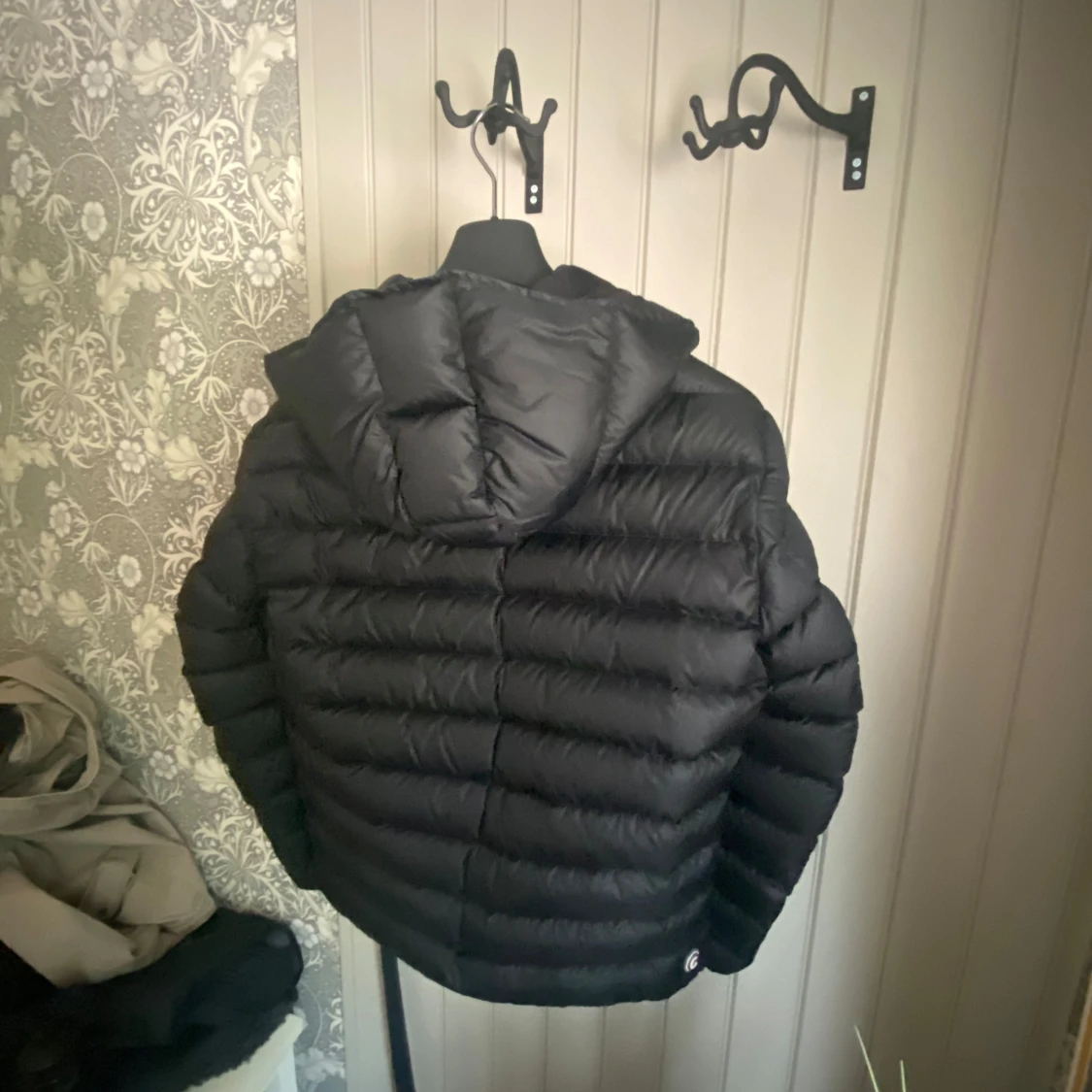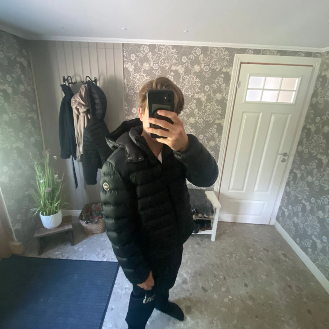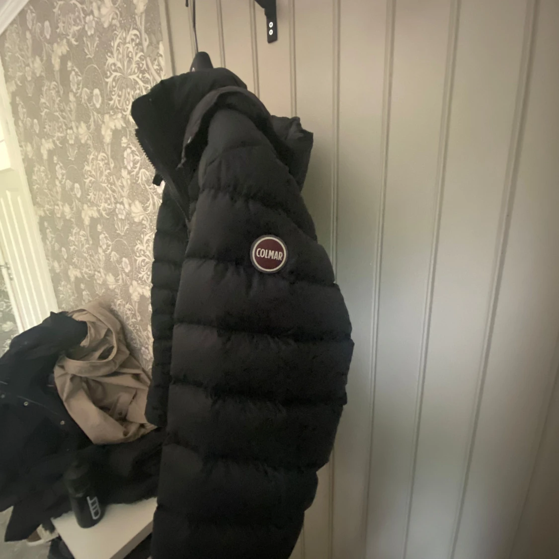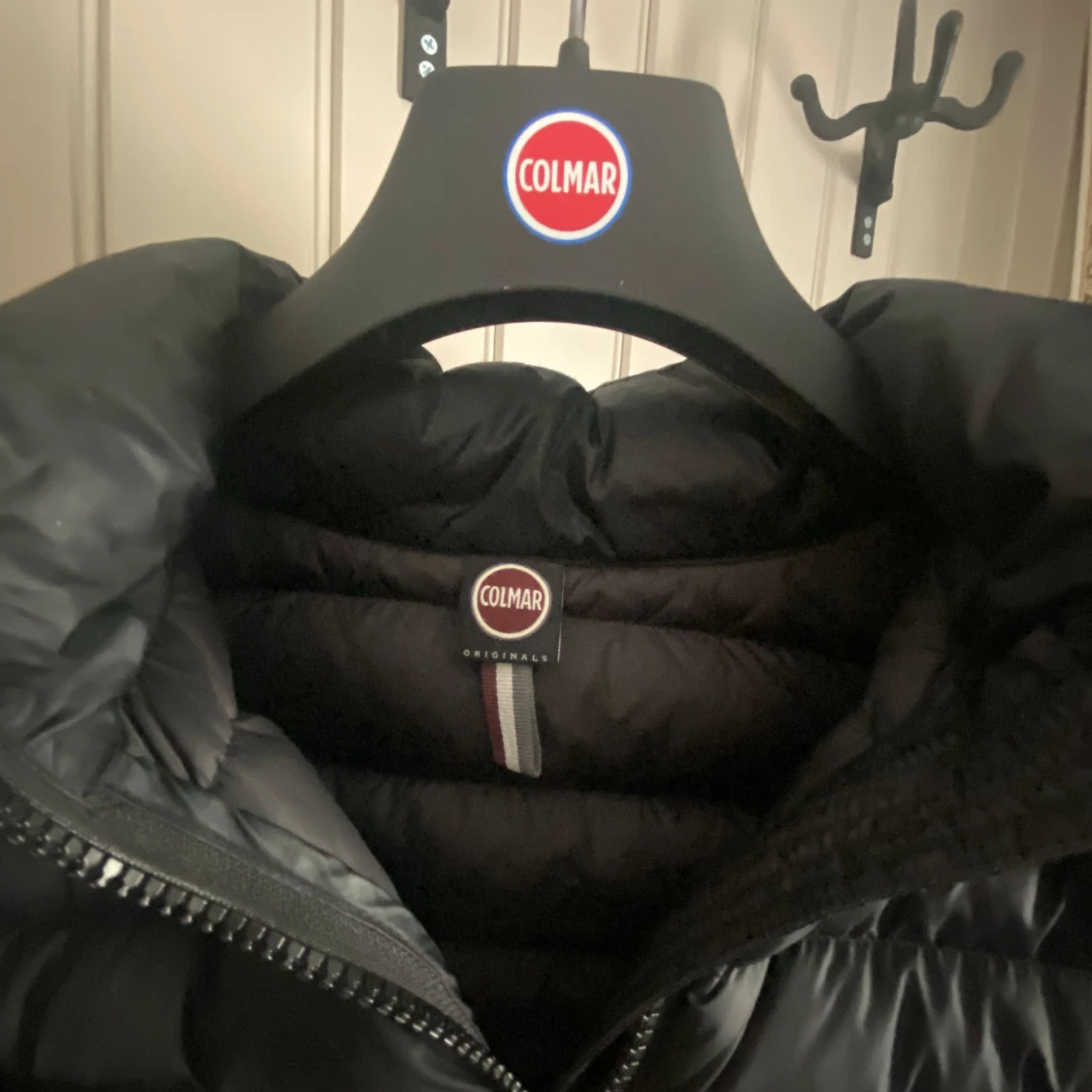 Säljer en svart dunjacka från Colmar med avtagbar huva och dragkedja framtill. Jackan har en clean look med diskret logga på ärmen och är perfekt för kalla dagar. Fylld med dun och har en klassisk pufferstil som är både snygg och bekväm.