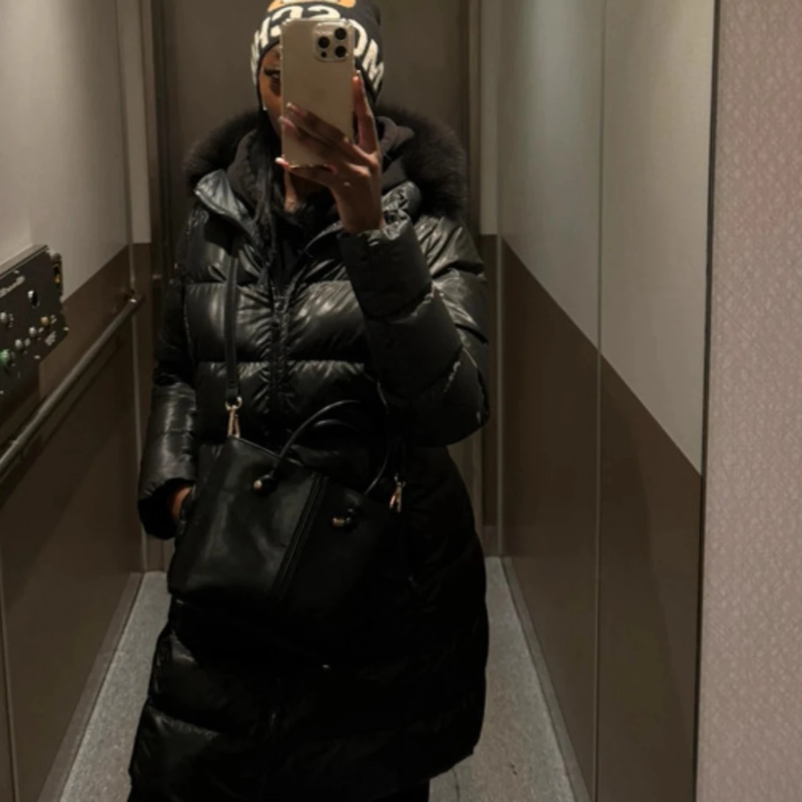Säljer en svart, lång pufferjacka med glansig yta och stor huva med pälsdetalj. Jackan har dragkedja framtill och är perfekt för kalla dagar. Den har en oversized passform och långa ärmar, vilket gör den extra mysig och trendig.