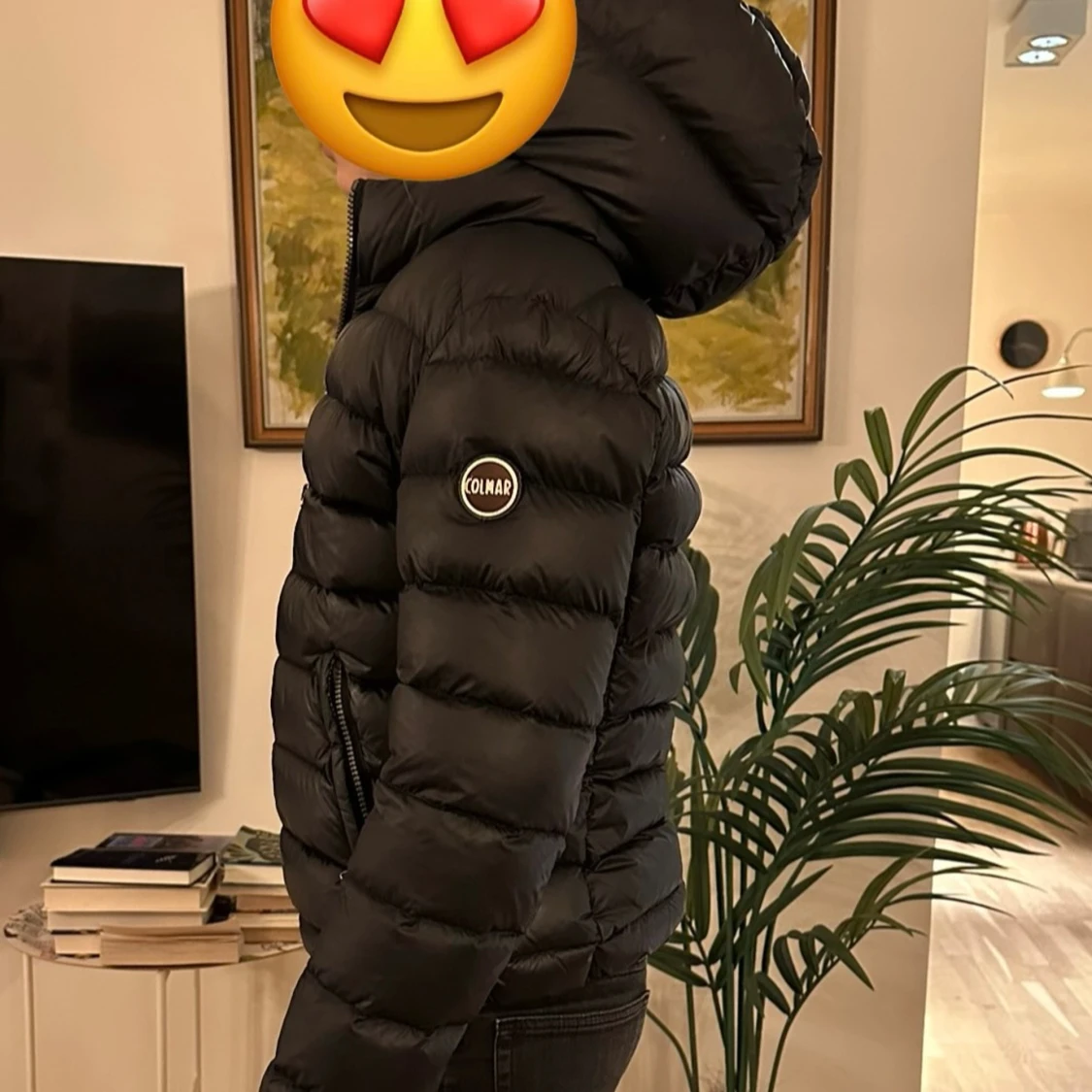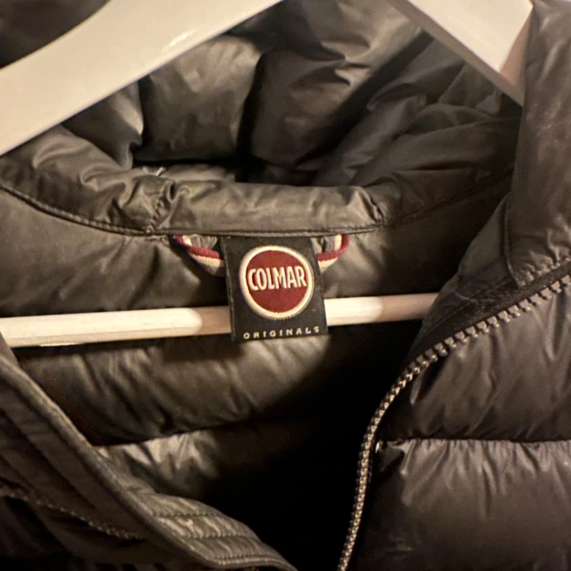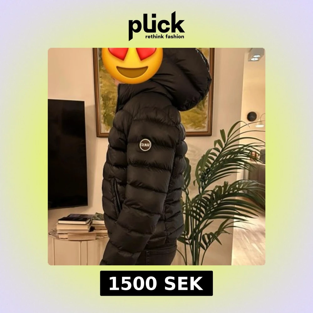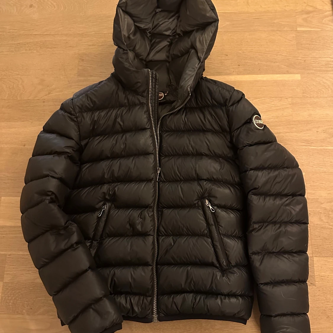 Svart dunjacka från Colmar med huva och dragkedja. Jackan är quiltad och har en klassisk pufferstil med diskret logga på ärmen. Perfekt för kalla dagar! (En av bilderna är lånad).