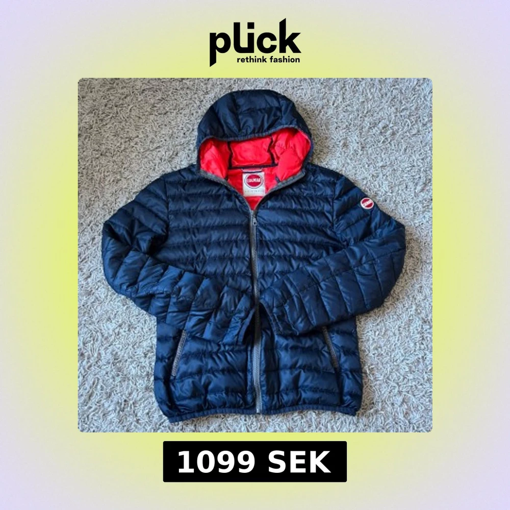 Säljer en snygg mörkblå pufferjacka från Colmar med en kontrasterande röd insida.