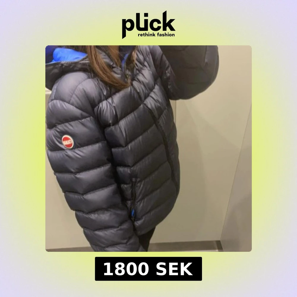 Säljer en mörkblå dunjacka från Colmar med huva och dragkedja framtill. Jackan har ett quiltat mönster och en rund Colmar-logga på ärmen. Perfekt för kalla dagar och har en snygg, sportig look.