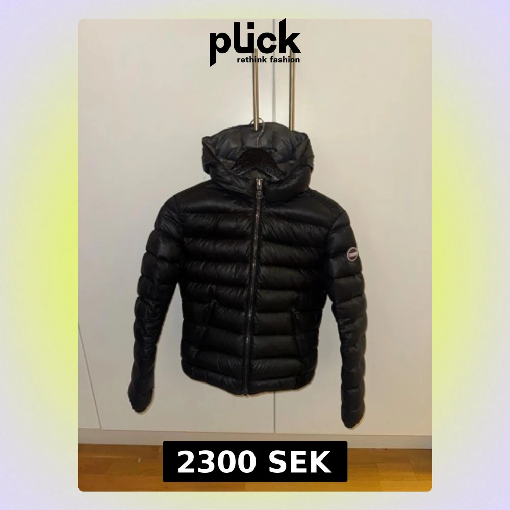 Säljer en svart dunjacka från Colmar med huva och dragkedja framtill. Jackan har ett stilrent, quiltat mönster och logotyp på ärmen. Fylld med naturligt dun för extra värme och har två fickor med dragkedja. Perfekt för kalla dagar och snygg till streetwear.