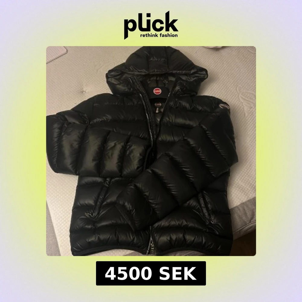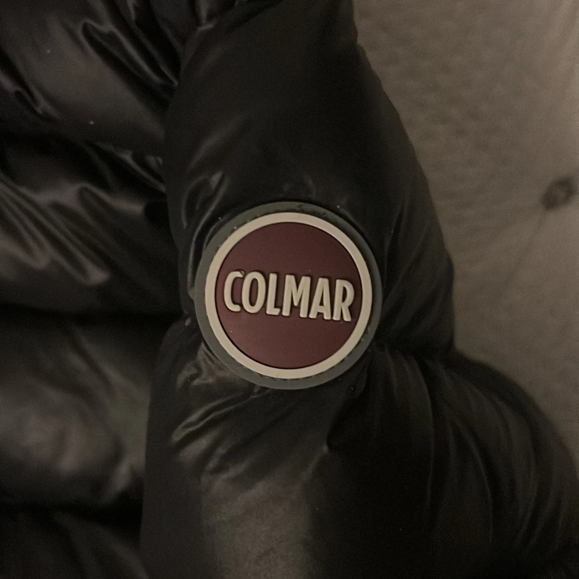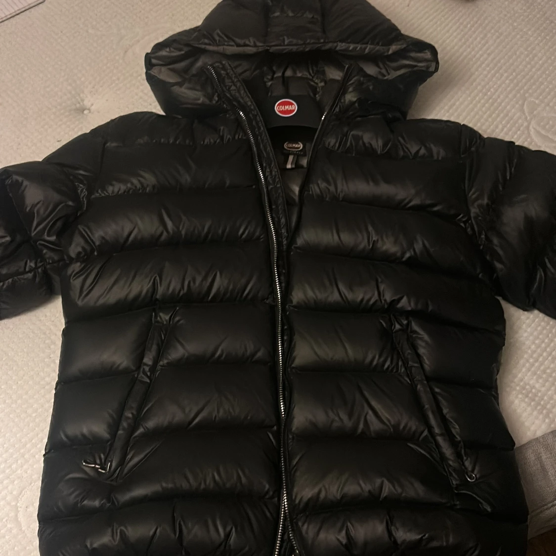 Säljer en svart pufferjacka från Colmar med huva och två sidofickor med dragkedja. Jackan har ett stilrent, quiltat mönster och logotyp på ärmen. Perfekt för kalla dagar. Dragkedja framtill och mjukt, syntetmaterial. Lite av loggan på baksidan har lossnat men inget som syns.