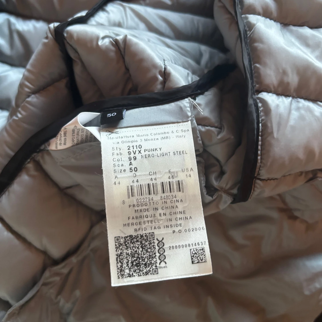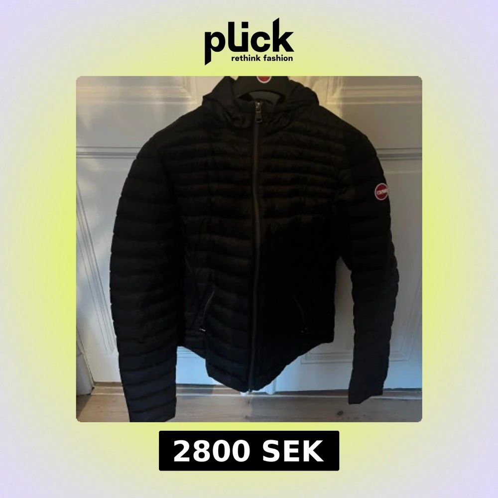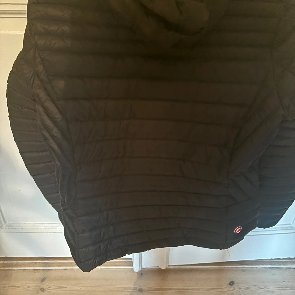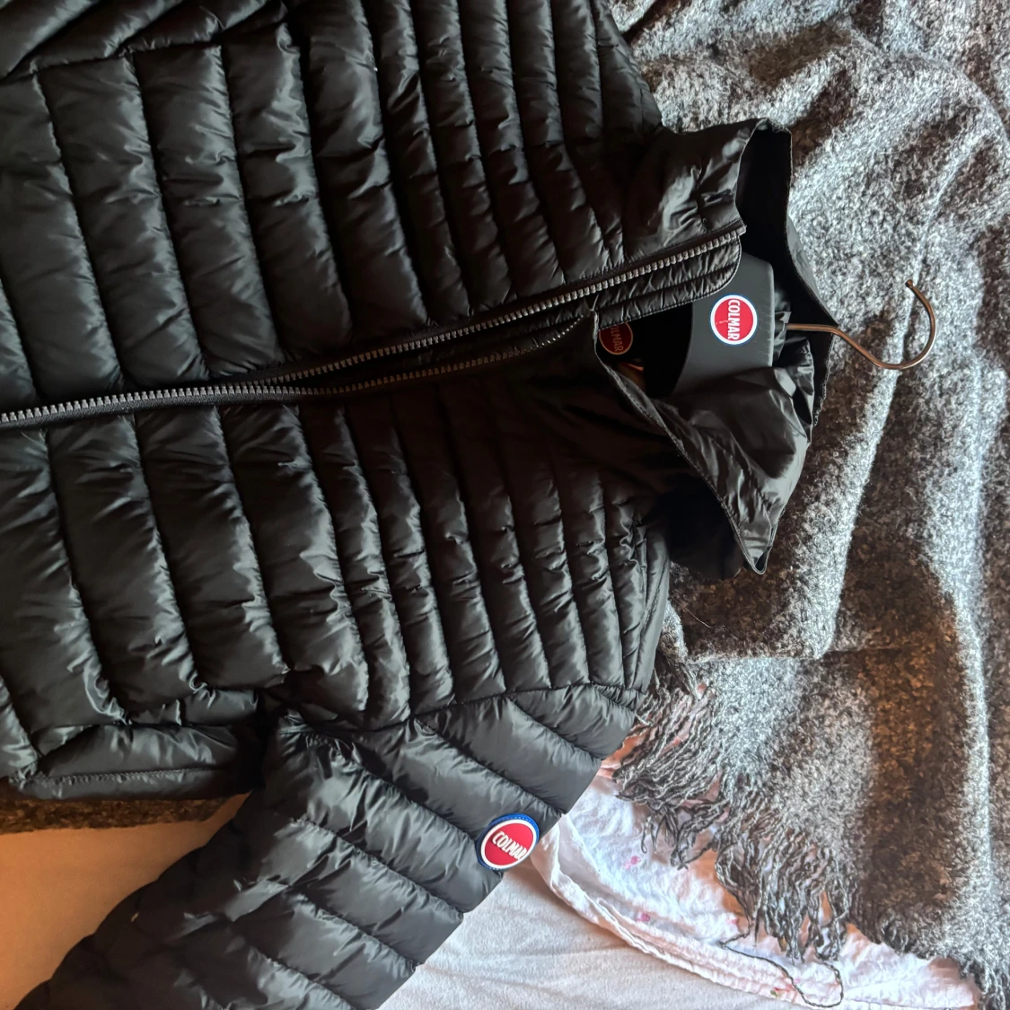 Snygg svart dunjacka från Colmar med horisontella sömmar och huva. Jackan har dragkedja framtill, två fickor med dragkedja och Colmar-logga på ärmen. Knappt använd
