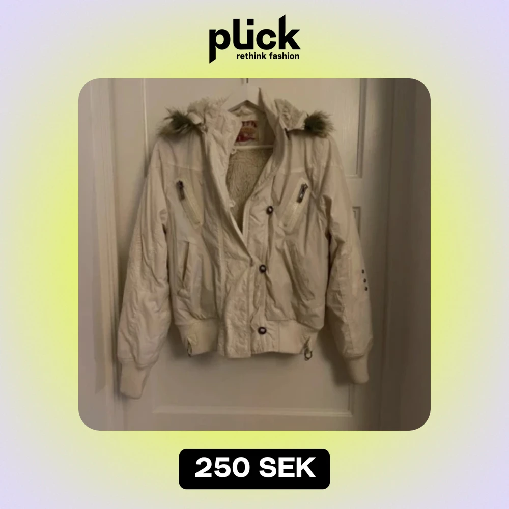Snygg vit vinterjacka med en pälsluva och massvis med fickor. Fodrad på insidan och riktigt skön. Dragkedjan funkar ej men finns knappar så den går att stänga. Står storlek L men skulle snarare säga S/M