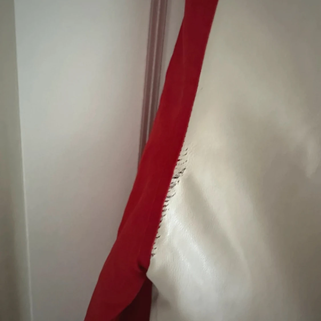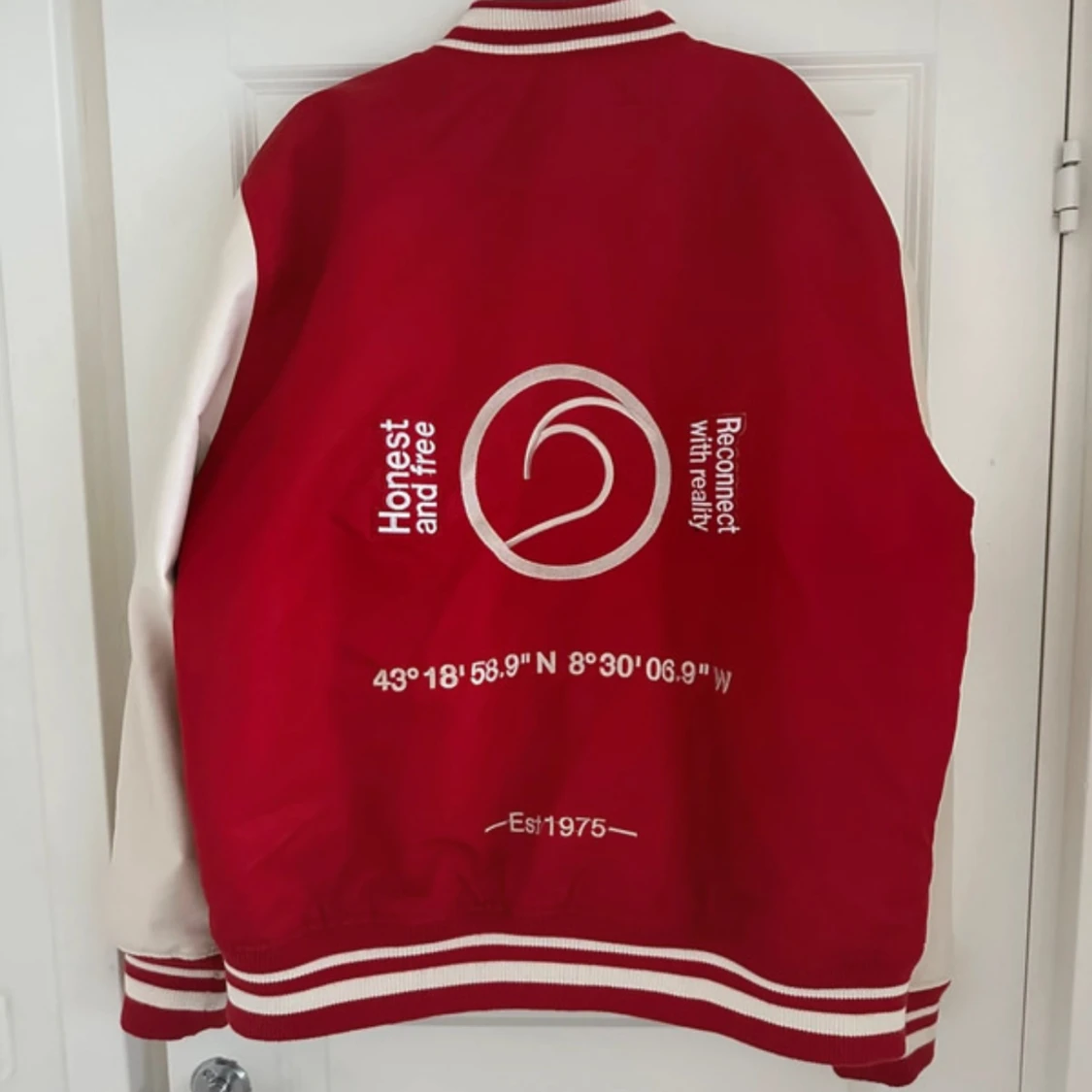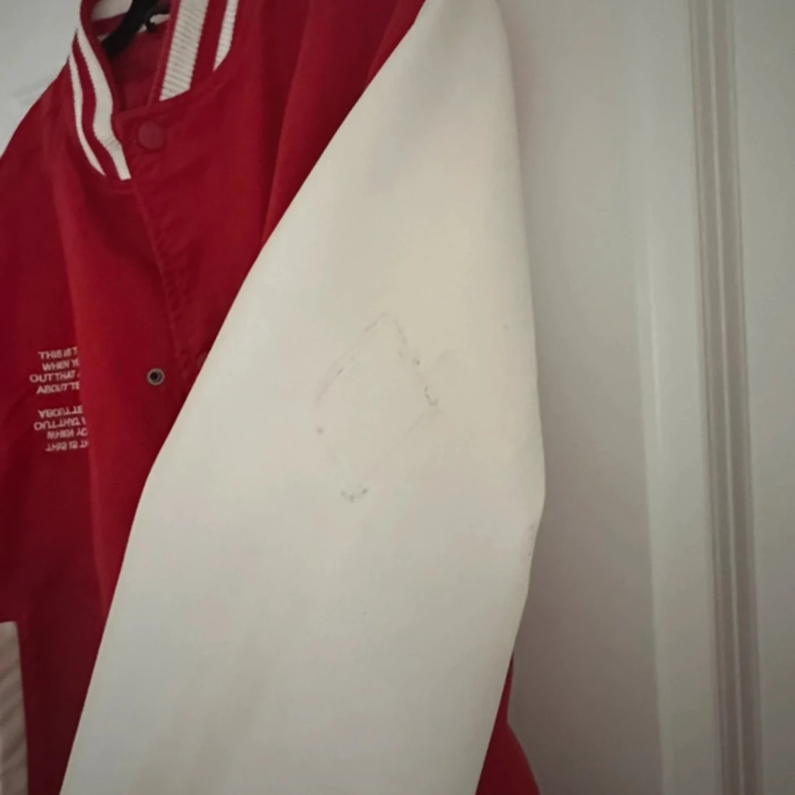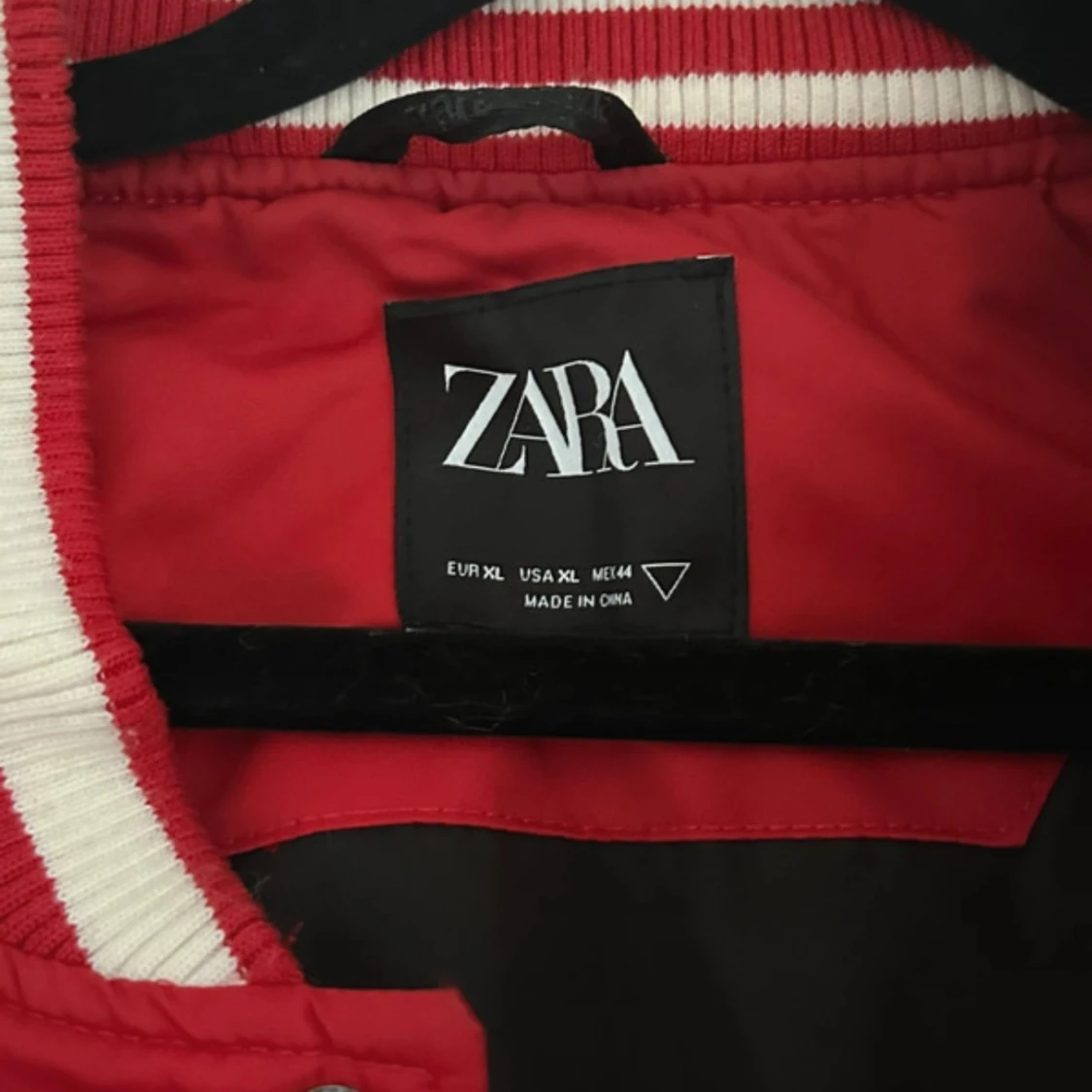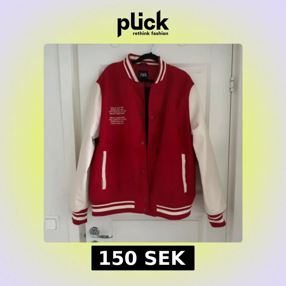 Säljer en klassisk varsityjacka från Zara i rött och vitt. Jackan har vita ärmar, röda muddar med vita ränder och knappar framtill. Två fickor med vita detaljer och broderad text på bröstet. Tagit bort en klisterlapp samt sömnen har lossnat lite i armhålan (lagt in bilder)