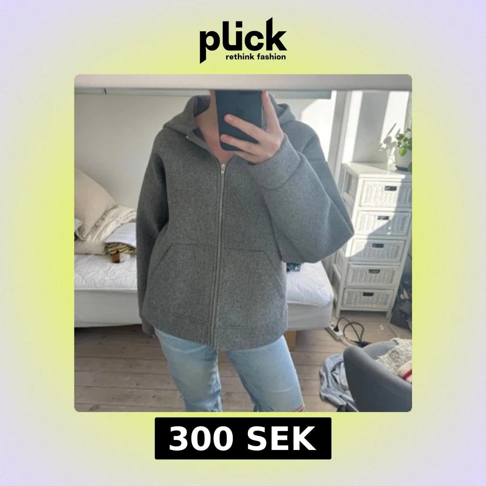 Säljer en stilren grå hoodie med dragkedja och huva. Den har en normal passform och är perfekt för kyligare dagar. Två praktiska fickor framtill gör den både snygg och funktionell.