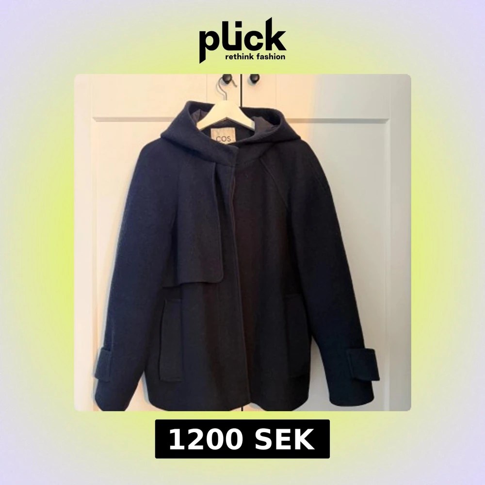 Snygg mörkblå jacka från COS i ull med huva och stora fickor framtill. Jackan är endast använd ett fåtal gånger och som ny.